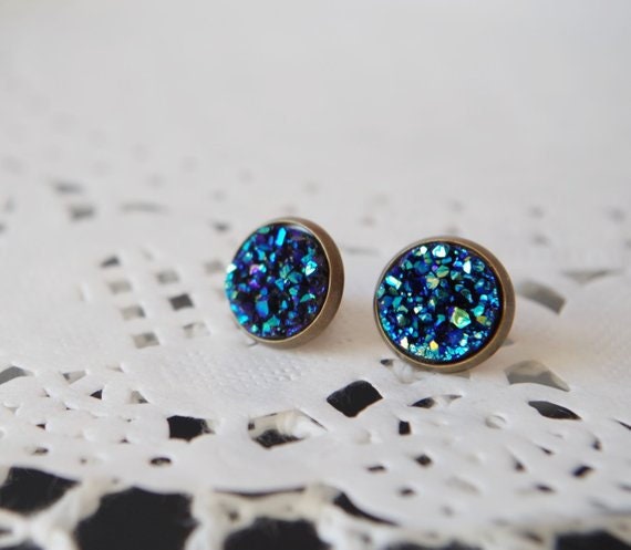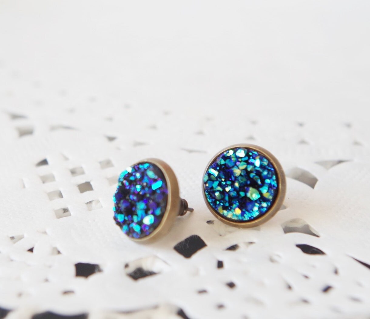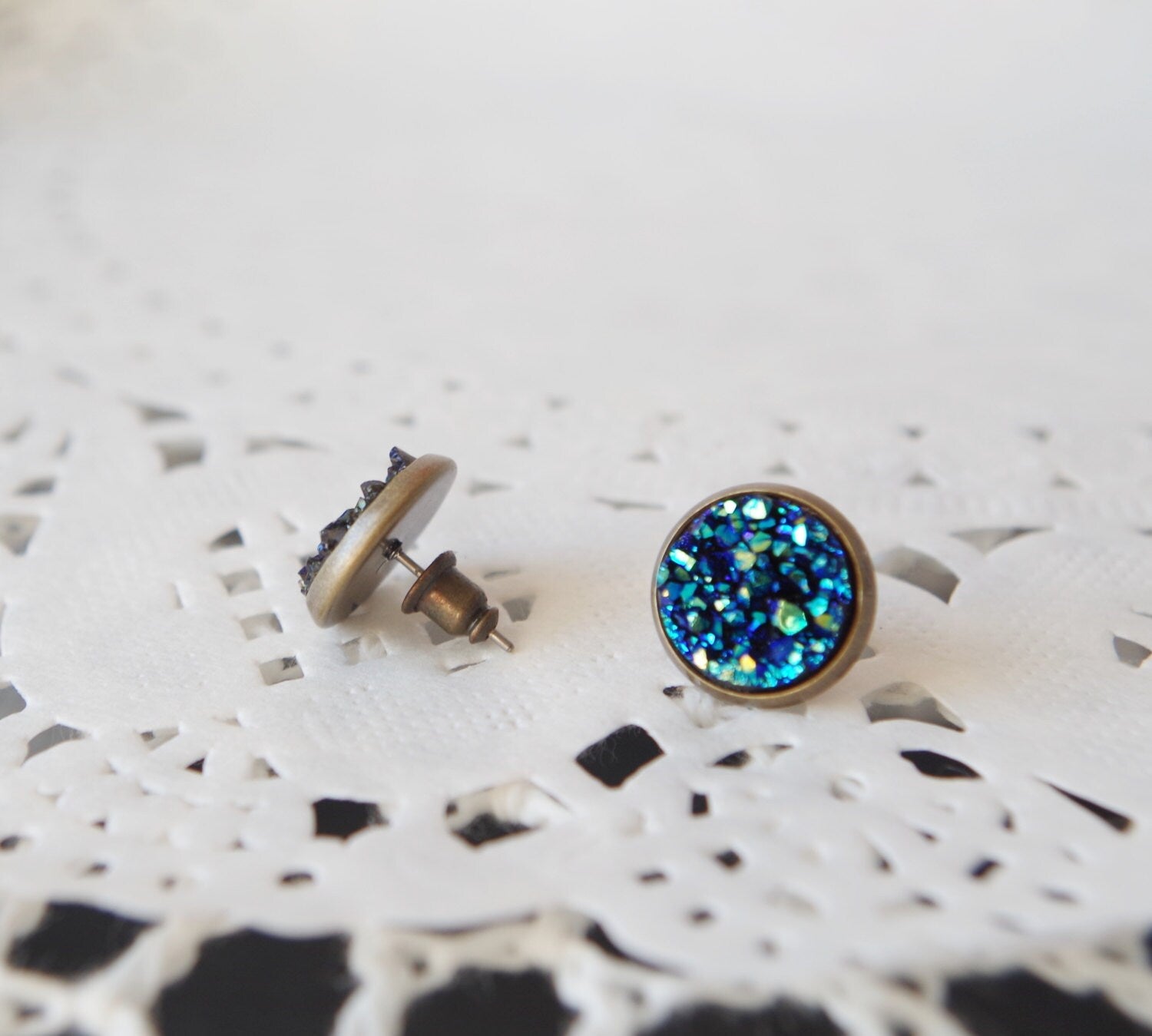 Blue druzy stud earrings Druzy post Druzy jewelry Small blue druzy studs Faux crystal earrings Crystal earrings Bridesmaid jewelry Tiny stud