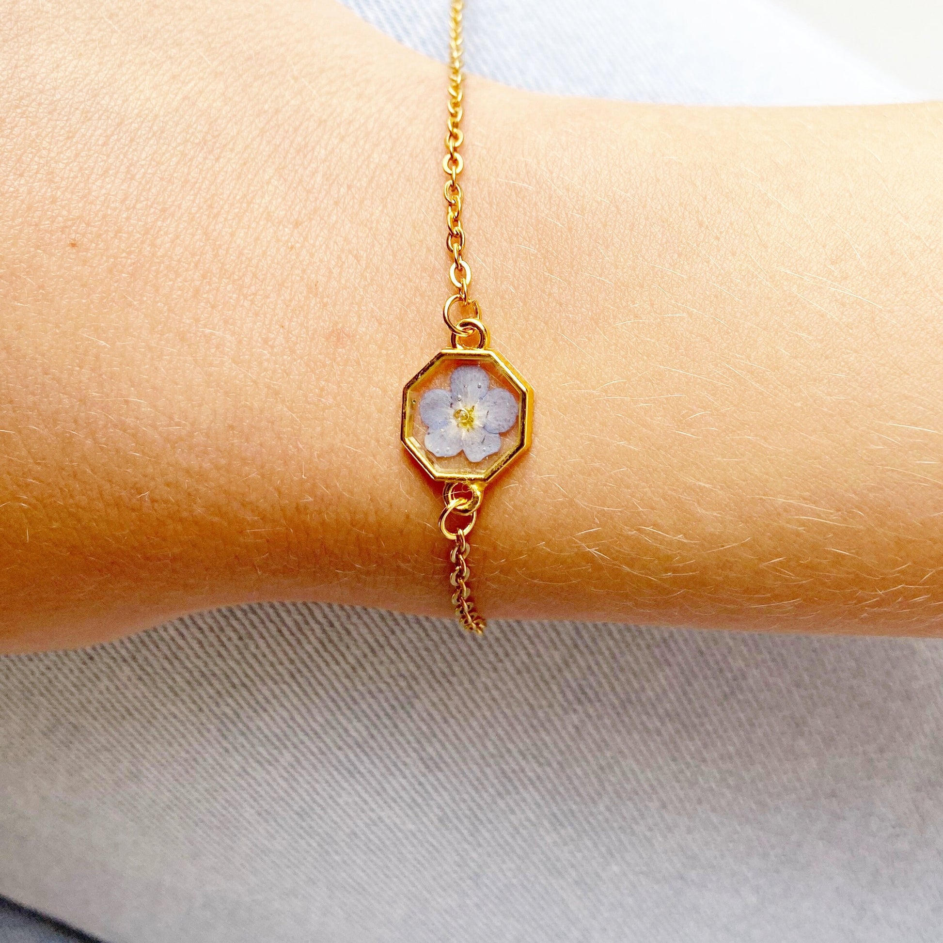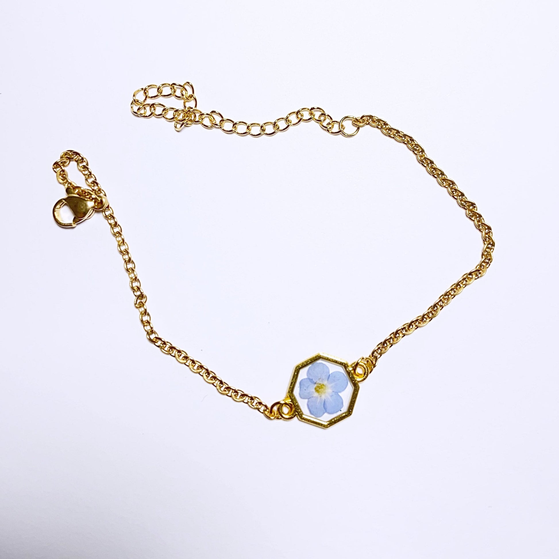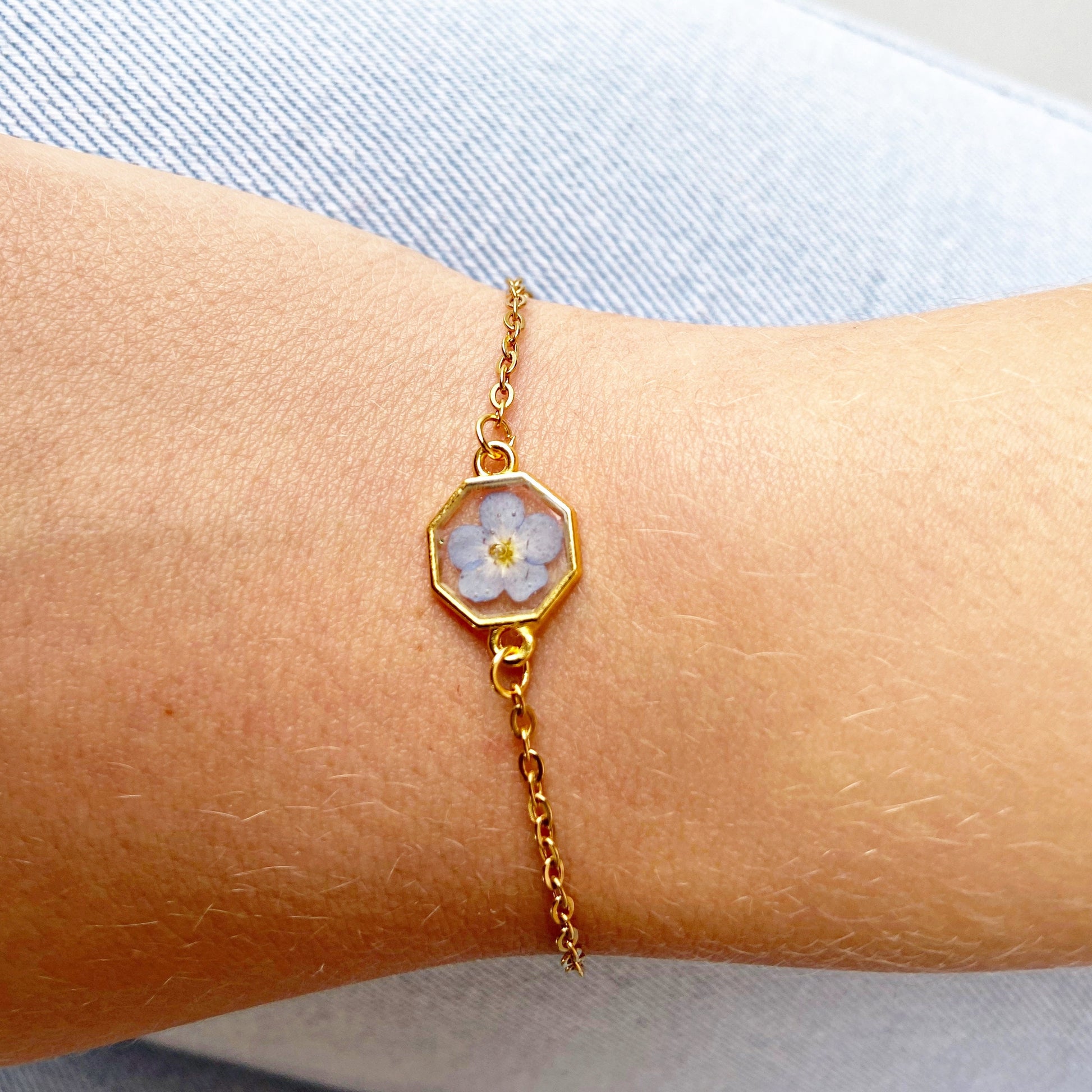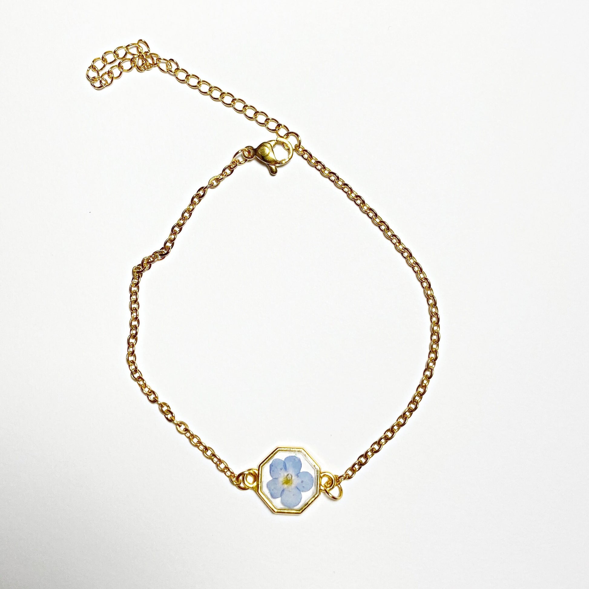 Bracelet Fleur Myosotis en Résine – Bijou Hexagonal Fait Main
