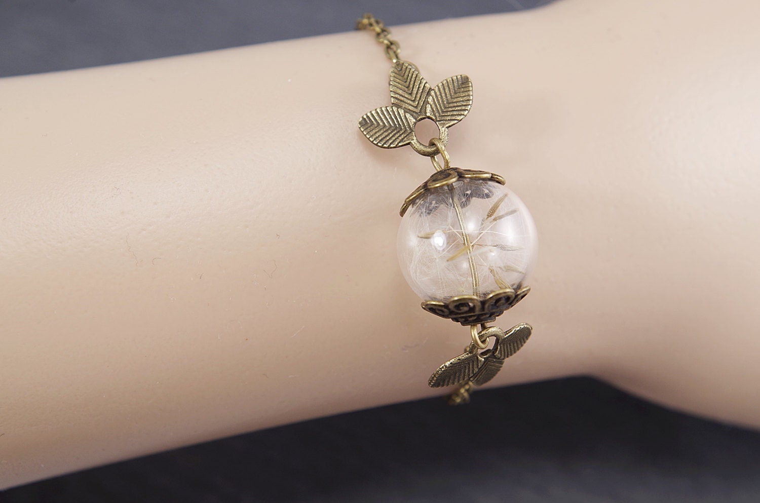 This hand blown glass hollow bead is filled with real dandelion seeds and embedded , which will spin nicely on your wrist. Length of the bracet is adjustable