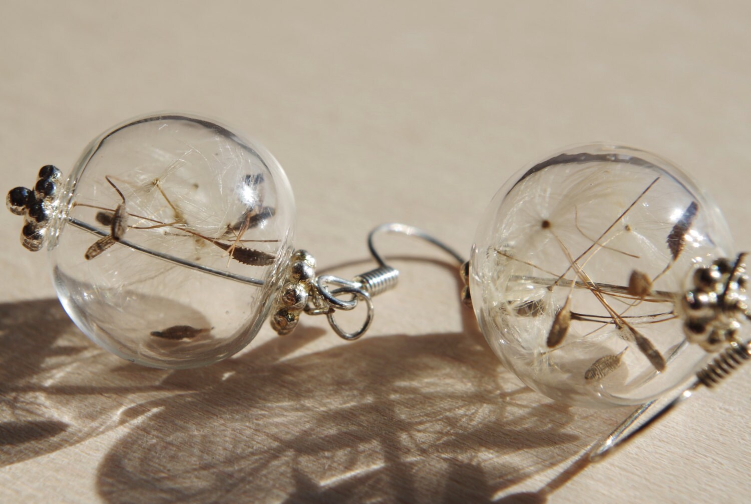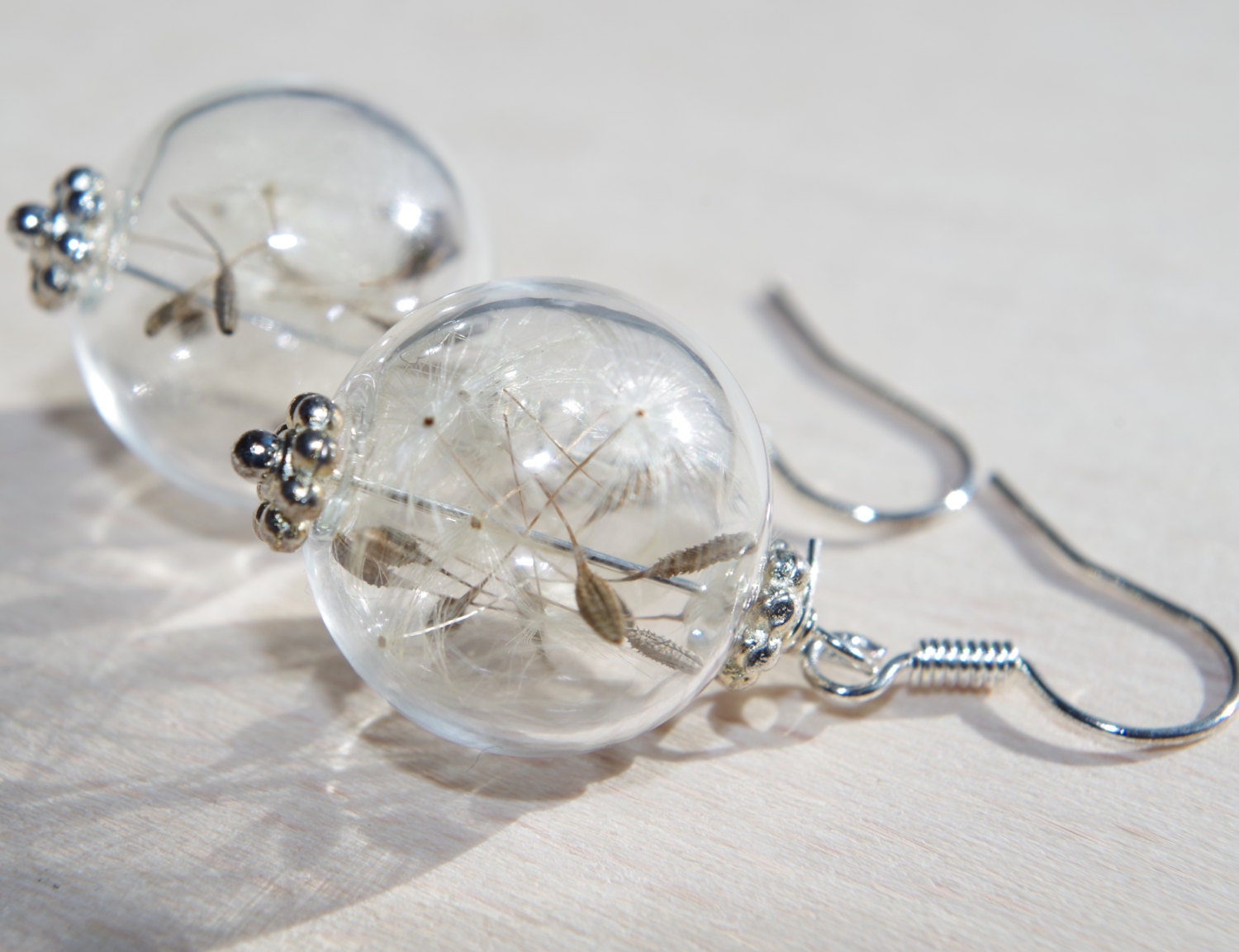 The glass orbs are filled with real dandelions and being closed by silver colored bead caps, hanging from classical ear wires. Nickel-free and anti-allergenic.
