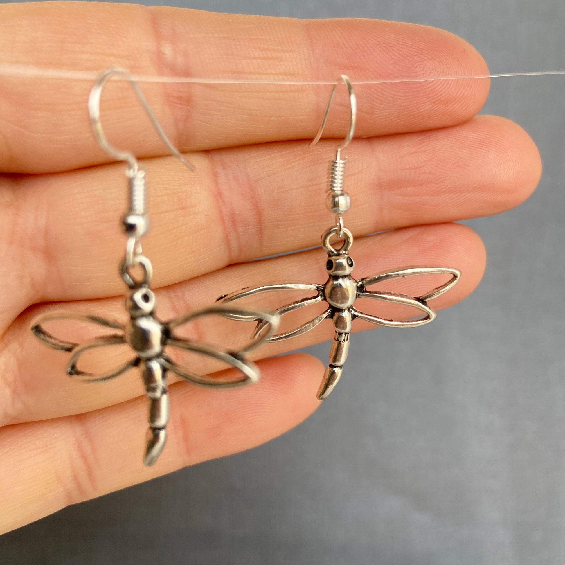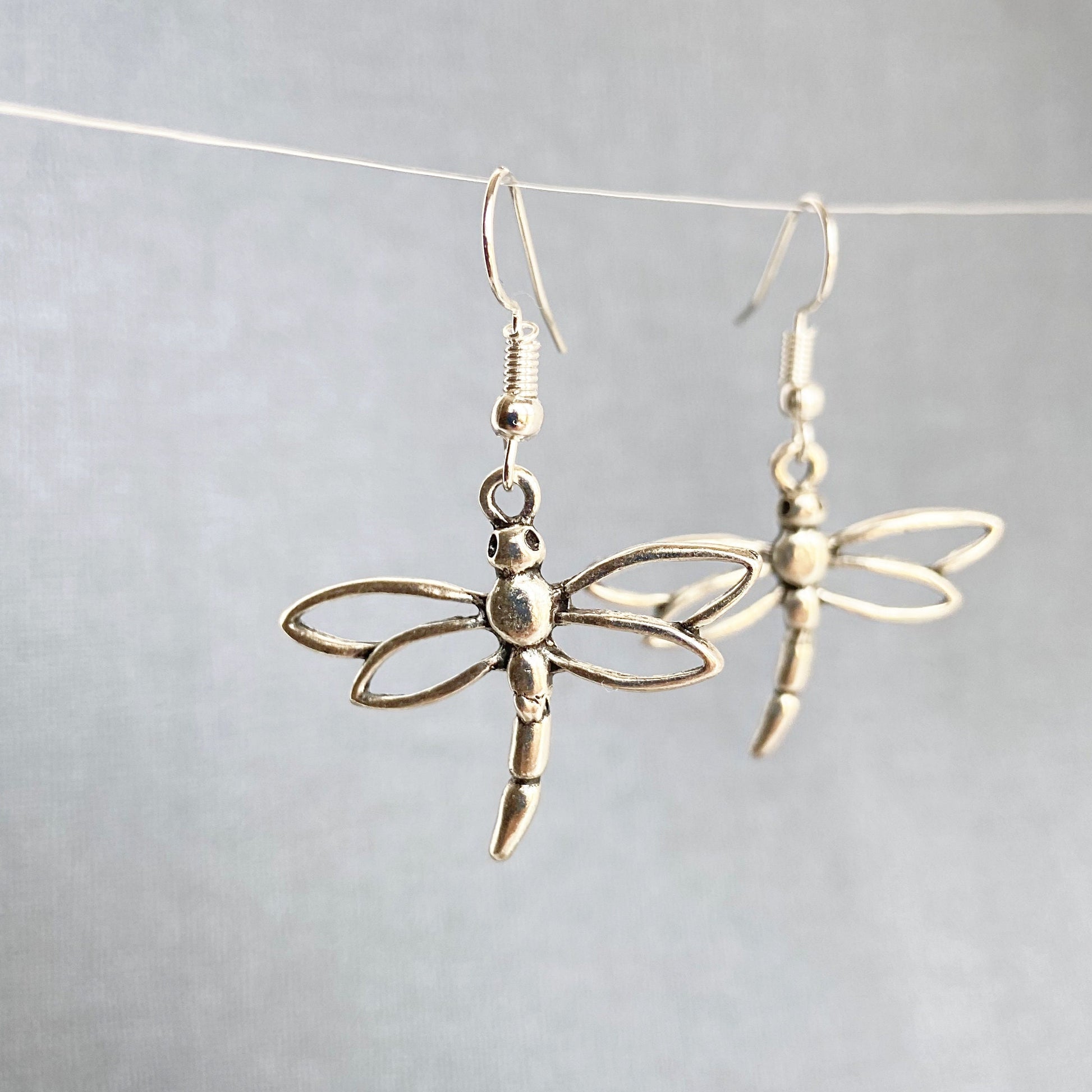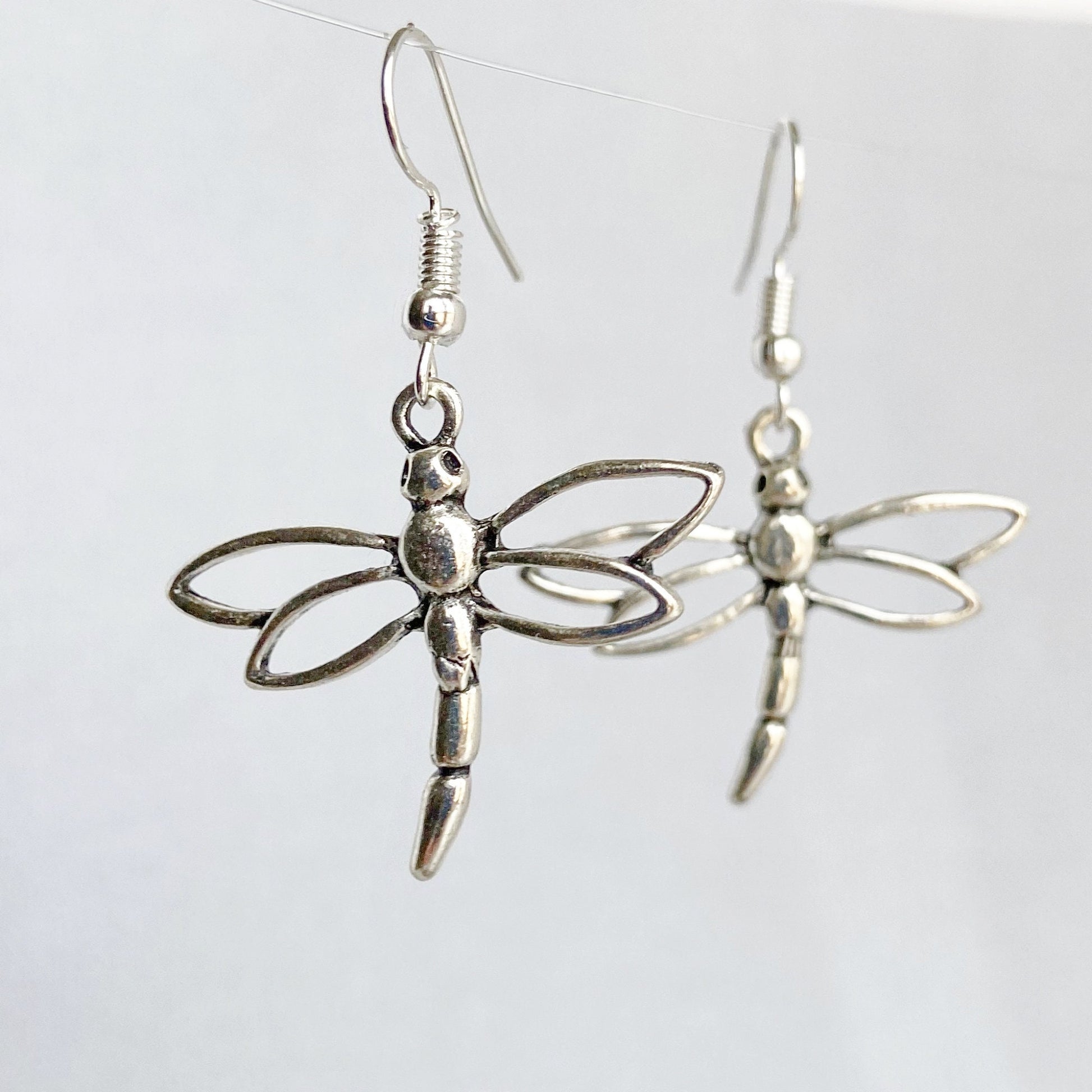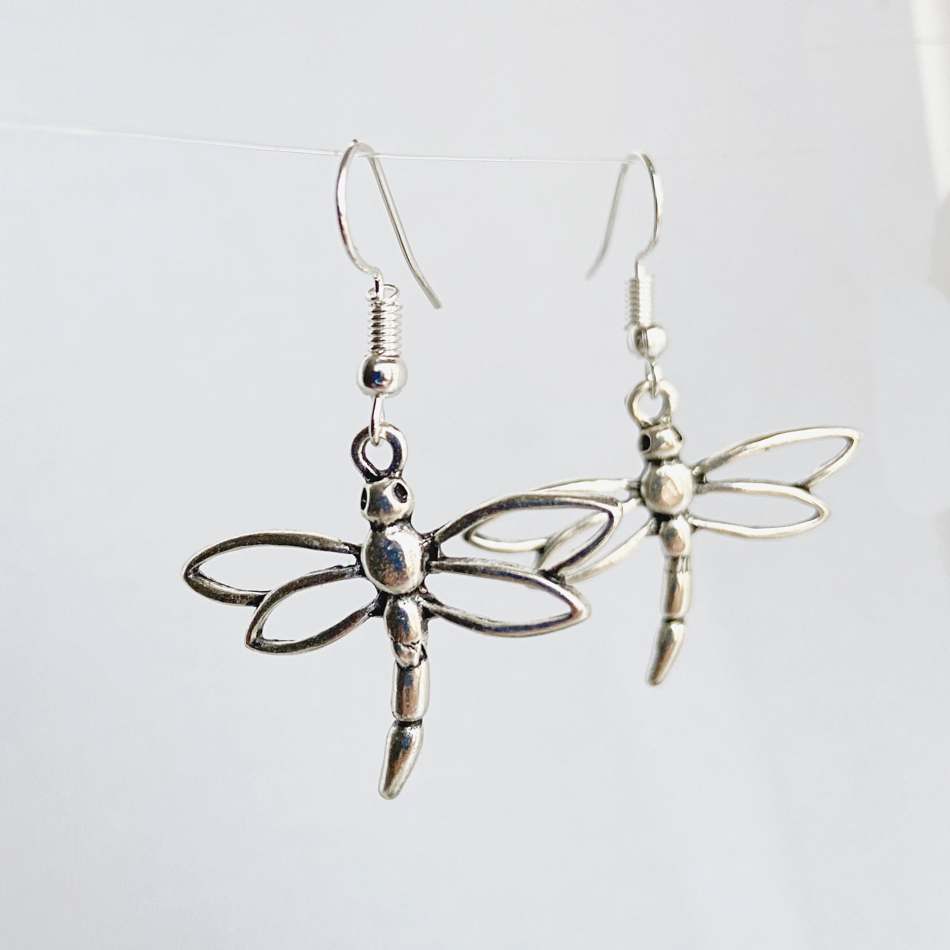 Stunning statement antique silver tone dragonfly design drop earrings. Beautiful designs on the wings. Fabulous statement earrings. Materials: silver tone brass Silver tone dragonfly charms measuring 28 mm x 30 mm hang from 15mm bronze tone kidney wires. These earrings would make an ideal special yet inexpensive gift. For pierced ears. All earrings are handmade by me. Earrings: https://www.etsy.com/shop/NewJewelleryStory?ref=seller-platform-mcnav§ion_id=17110923 Stud earrings: https://www.etsy.com/shop/NewJewelleryStory?ref=seller-platform-mcnav§ion_id=17213187 The earrings measure 2 inches long - 5cm from top to bottom All jewelry items will come to you nicely packaged in a gift box. Please visit all the items from my shop here: https://www.etsy.com/fr/shop/NewJewelleryStory?ref=hdr_shop_menu