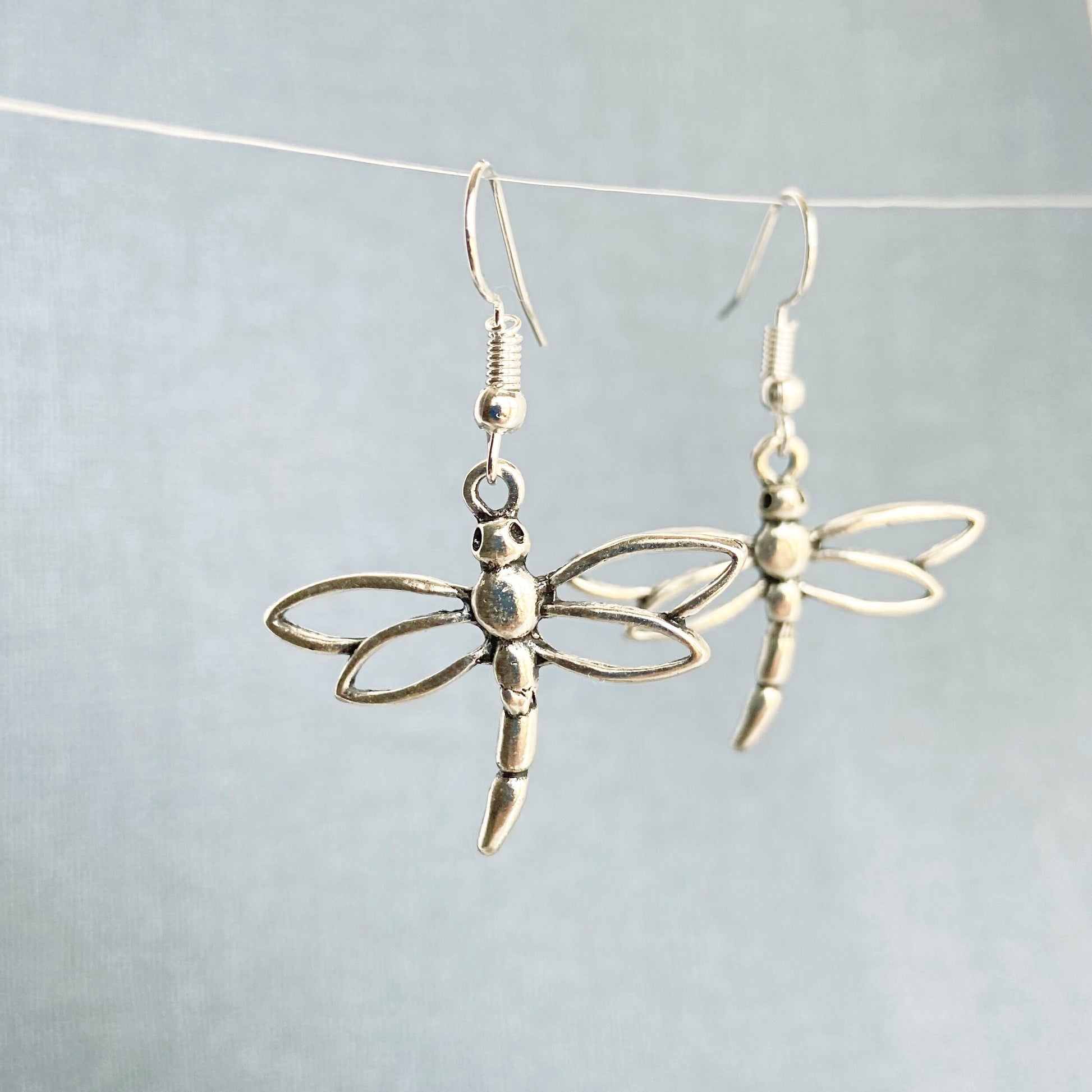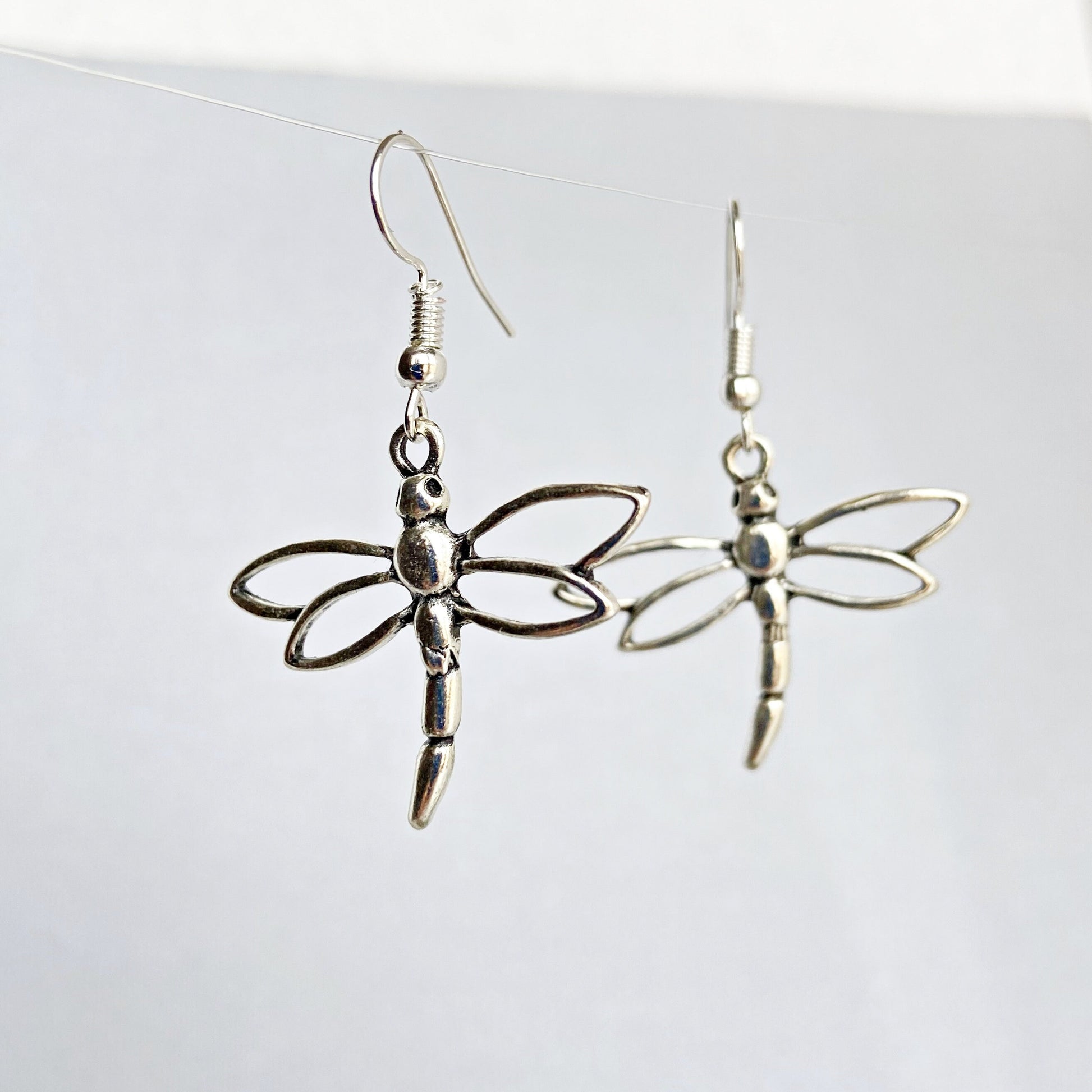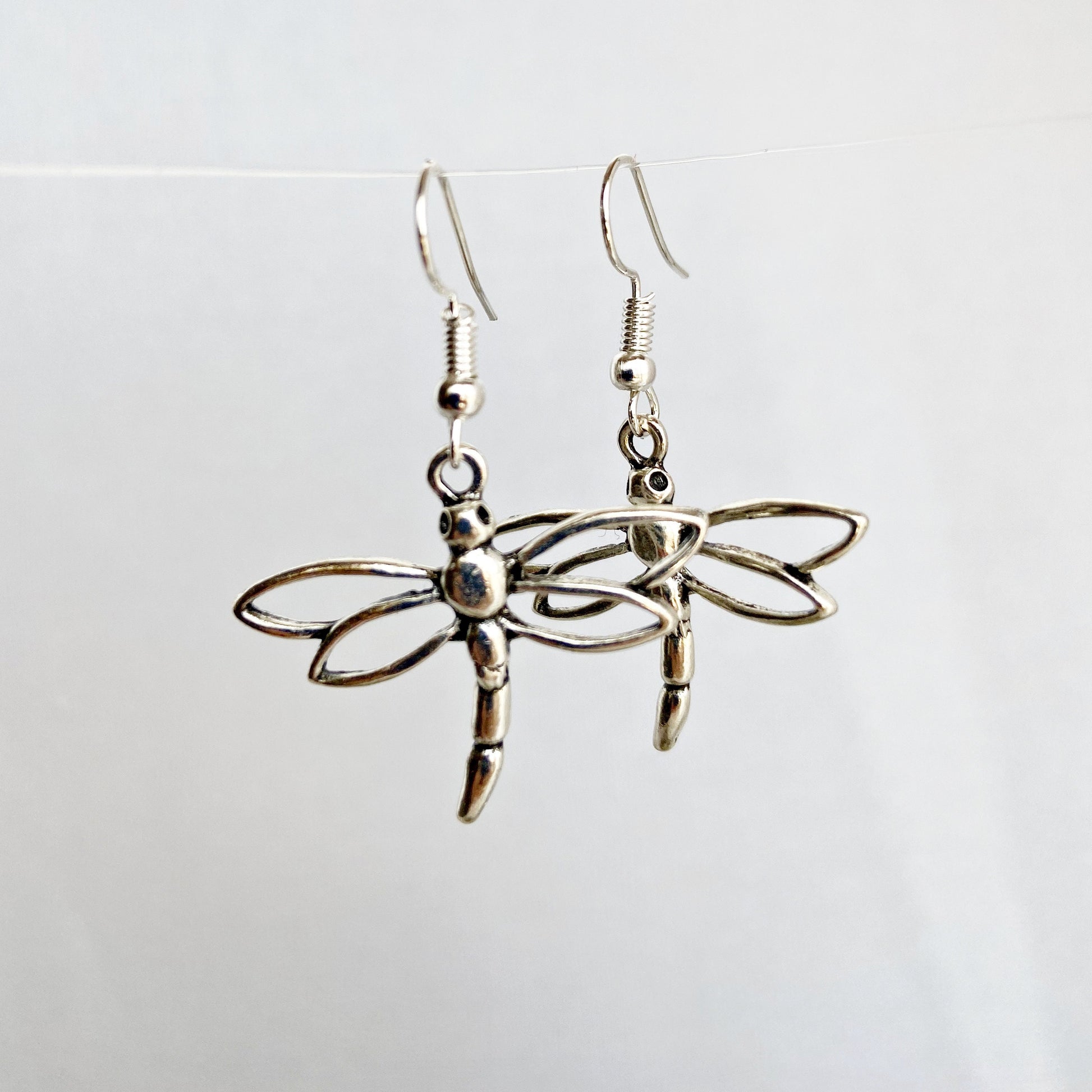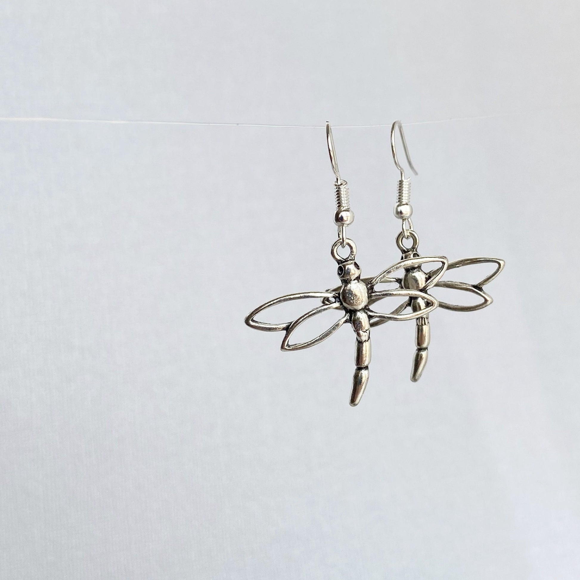 Stunning statement antique silver tone dragonfly design drop earrings. Beautiful designs on the wings. Fabulous statement earrings. Materials: silver tone brass Silver tone dragonfly charms measuring 28 mm x 30 mm hang from 15mm bronze tone kidney wires. These earrings would make an ideal special yet inexpensive gift. For pierced ears. All earrings are handmade by me. Earrings: https://www.etsy.com/shop/NewJewelleryStory?ref=seller-platform-mcnav§ion_id=17110923 Stud earrings: https://www.etsy.com/shop/NewJewelleryStory?ref=seller-platform-mcnav§ion_id=17213187 The earrings measure 2 inches long - 5cm from top to bottom All jewelry items will come to you nicely packaged in a gift box. Please visit all the items from my shop here: https://www.etsy.com/fr/shop/NewJewelleryStory?ref=hdr_shop_menu
