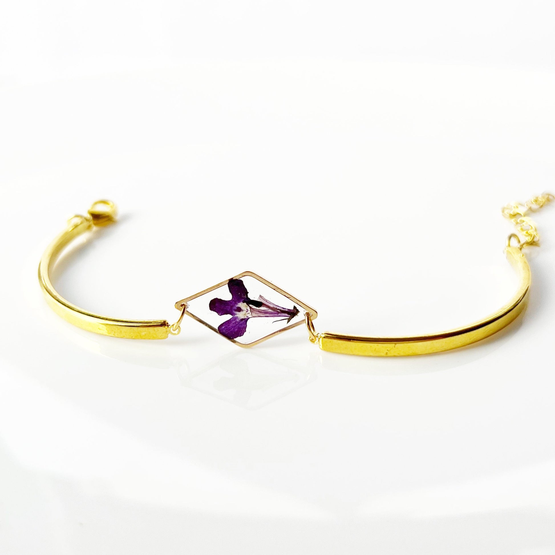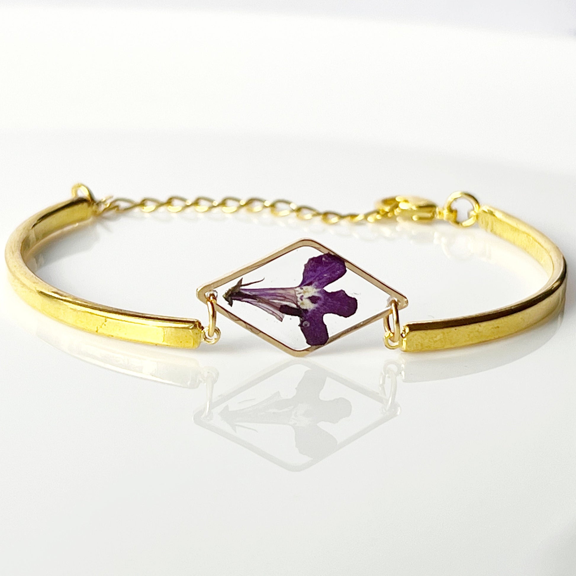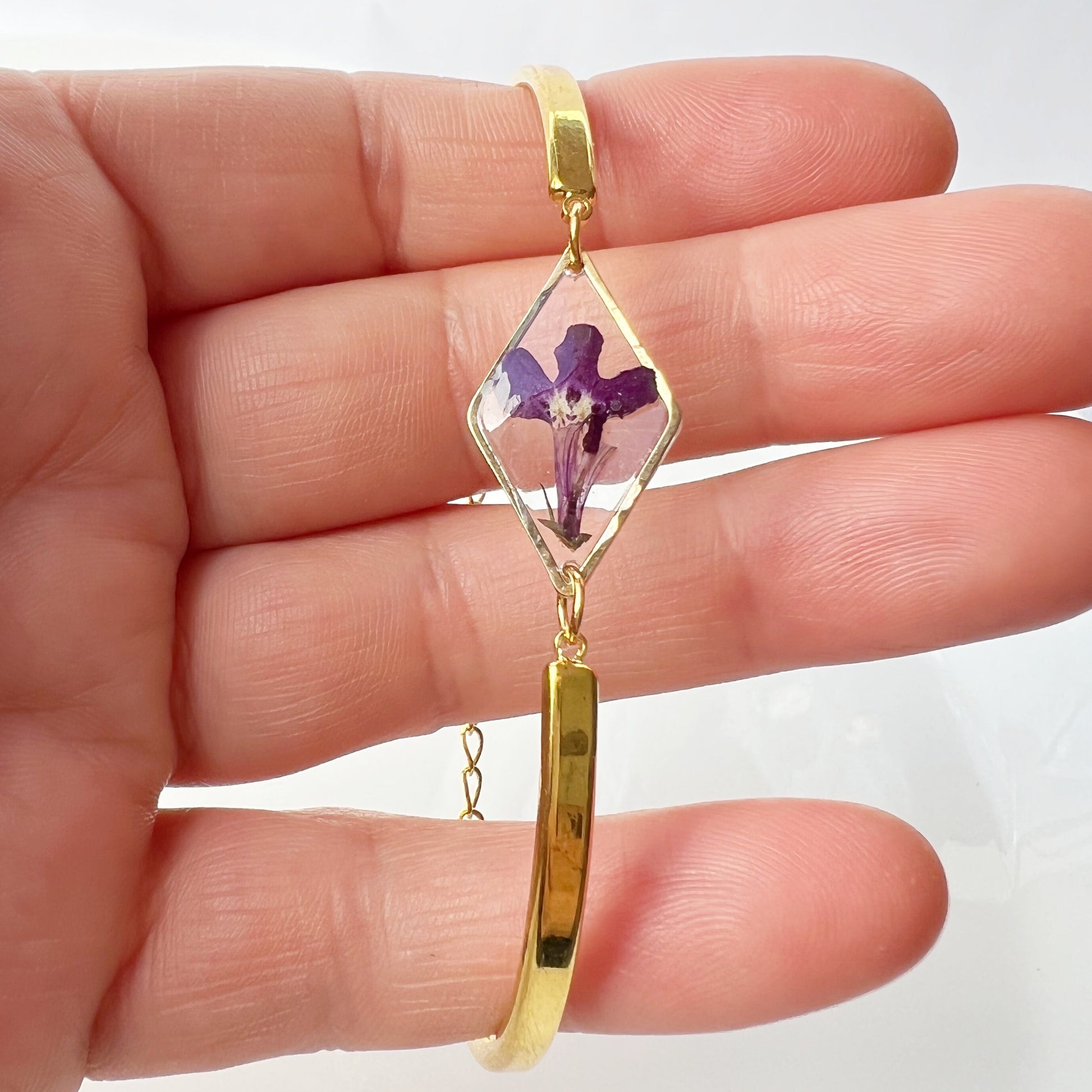 Gold bracelet with lobelia purple in resin Terrarium real flower jewelry Mothers day gift for mom Botanical adjustable bracelet for women