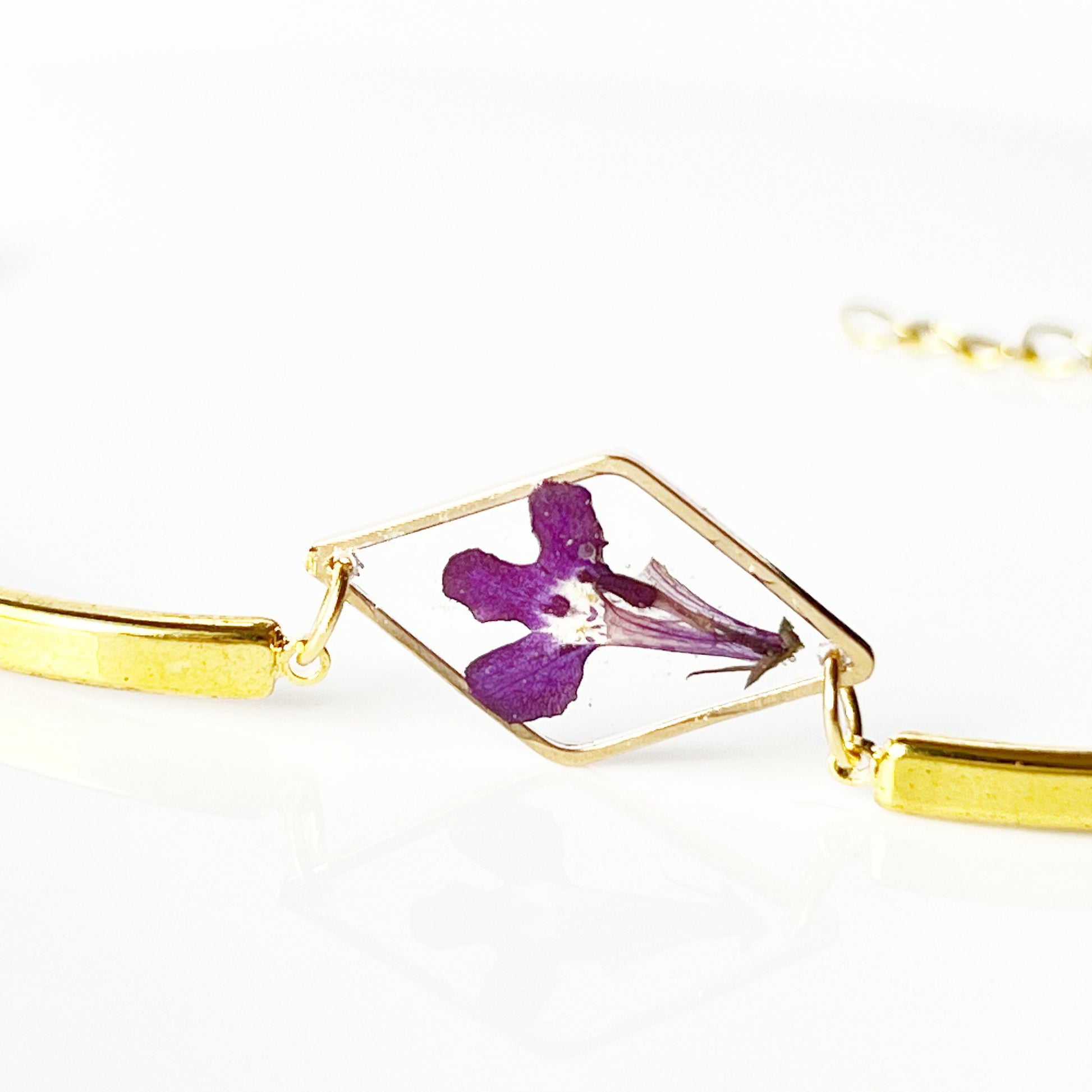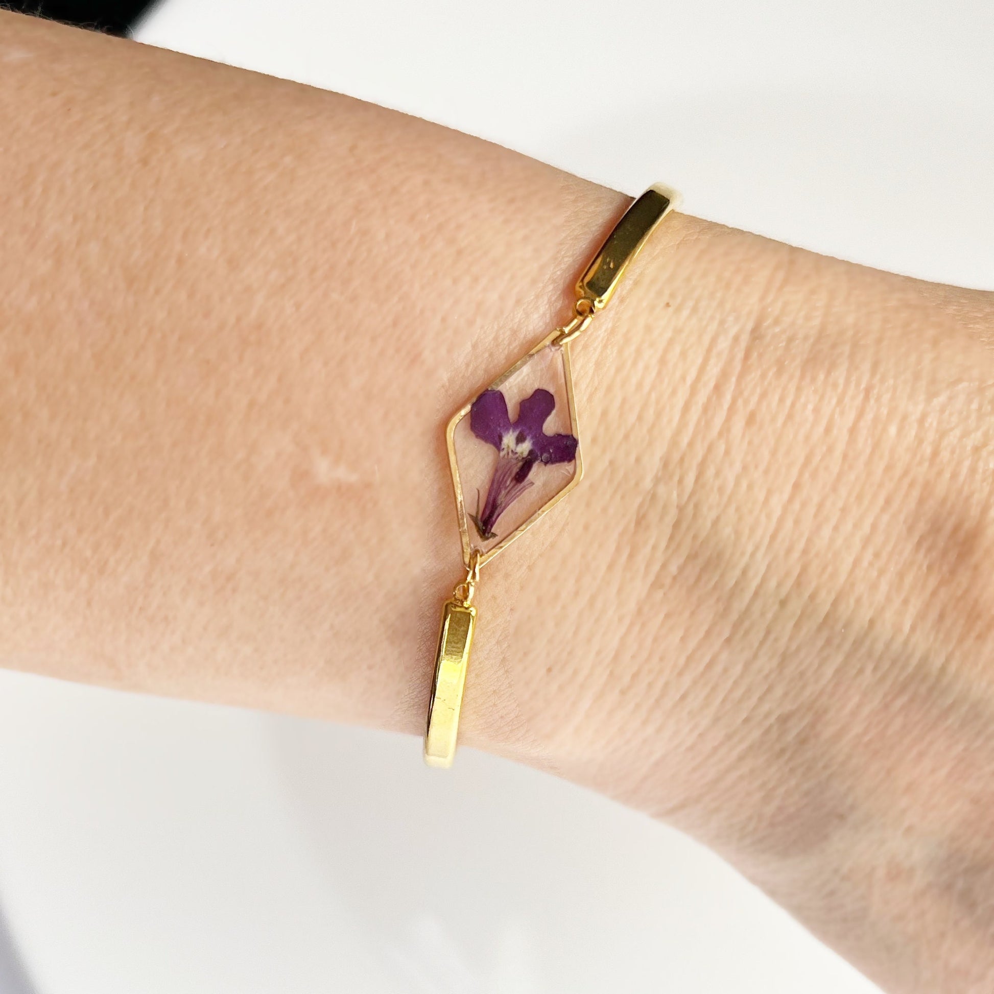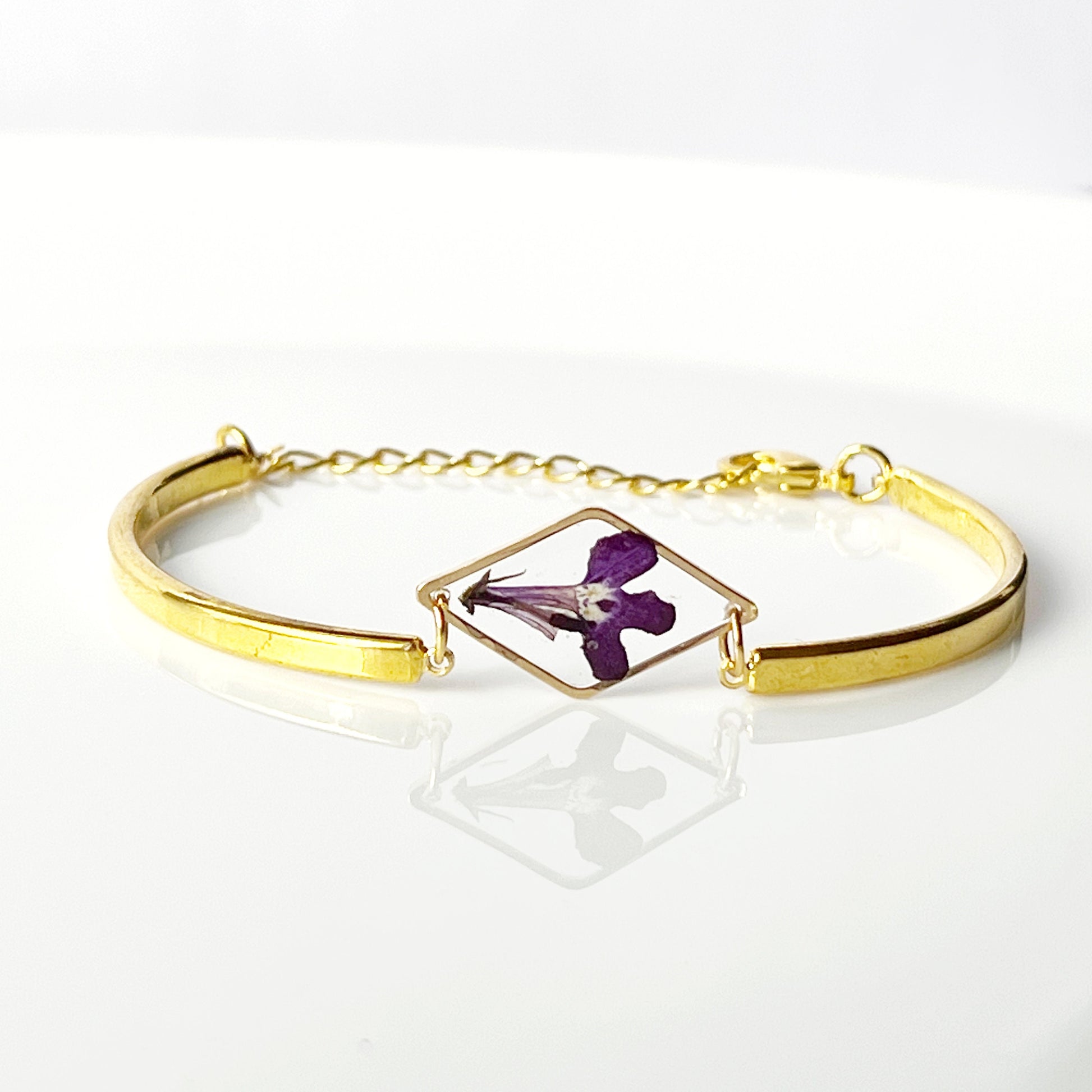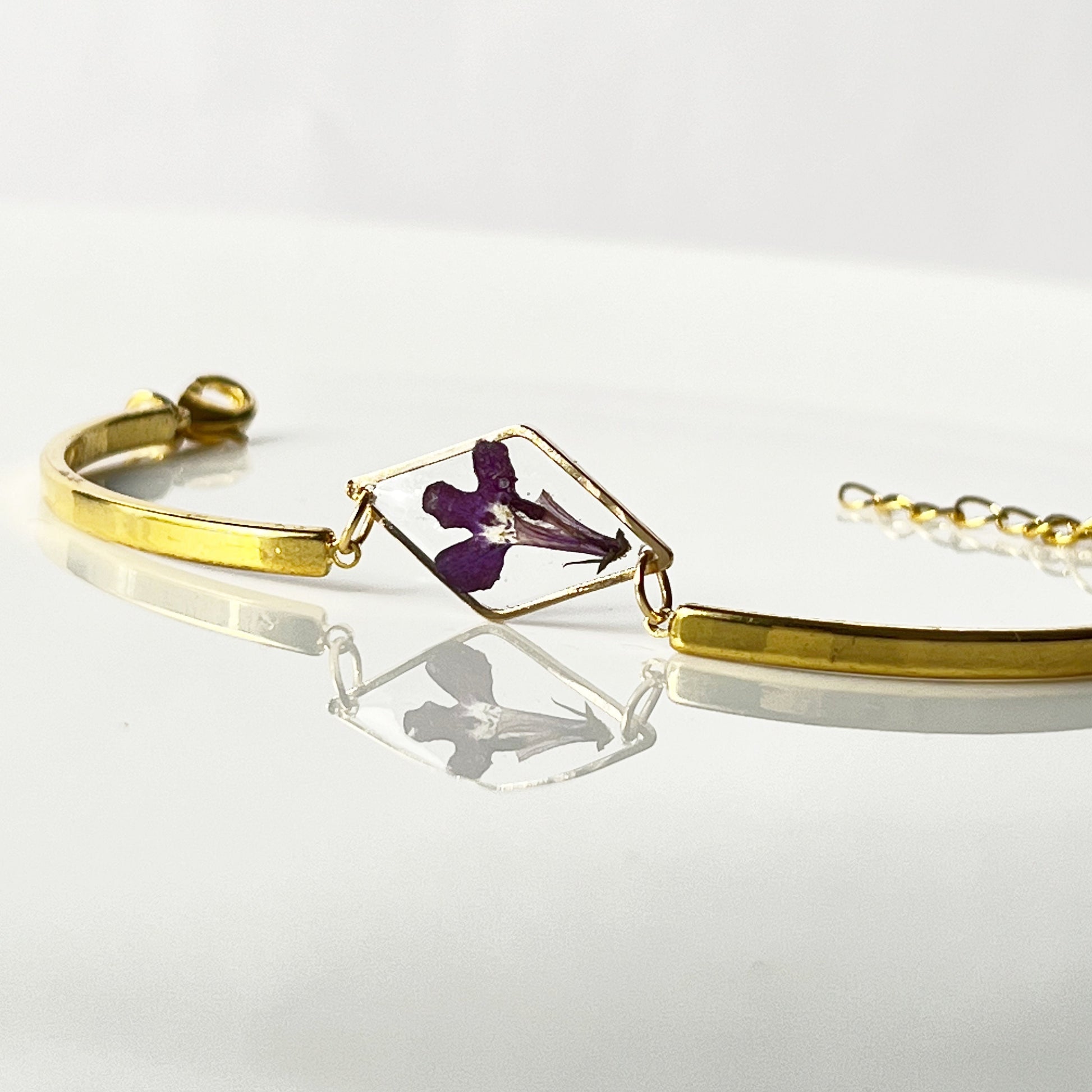 Gold bracelet with lobelia purple in resin Terrarium real flower jewelry Mothers day gift for mom Botanical adjustable bracelet for women