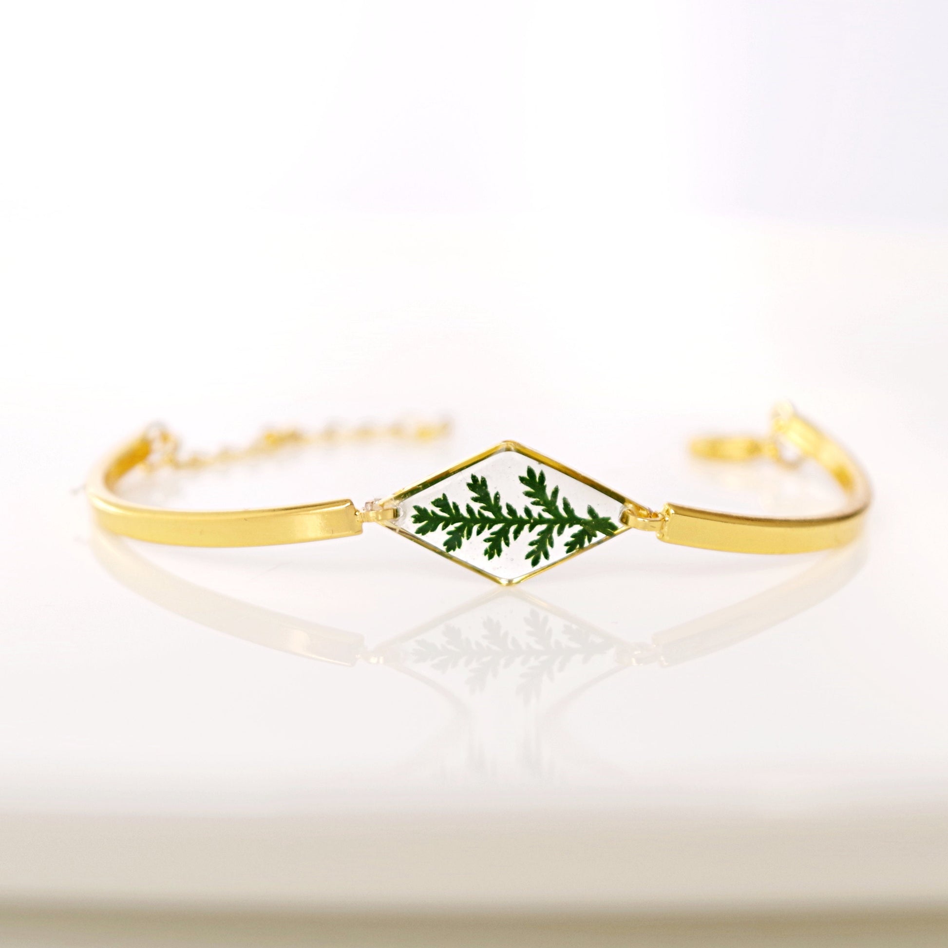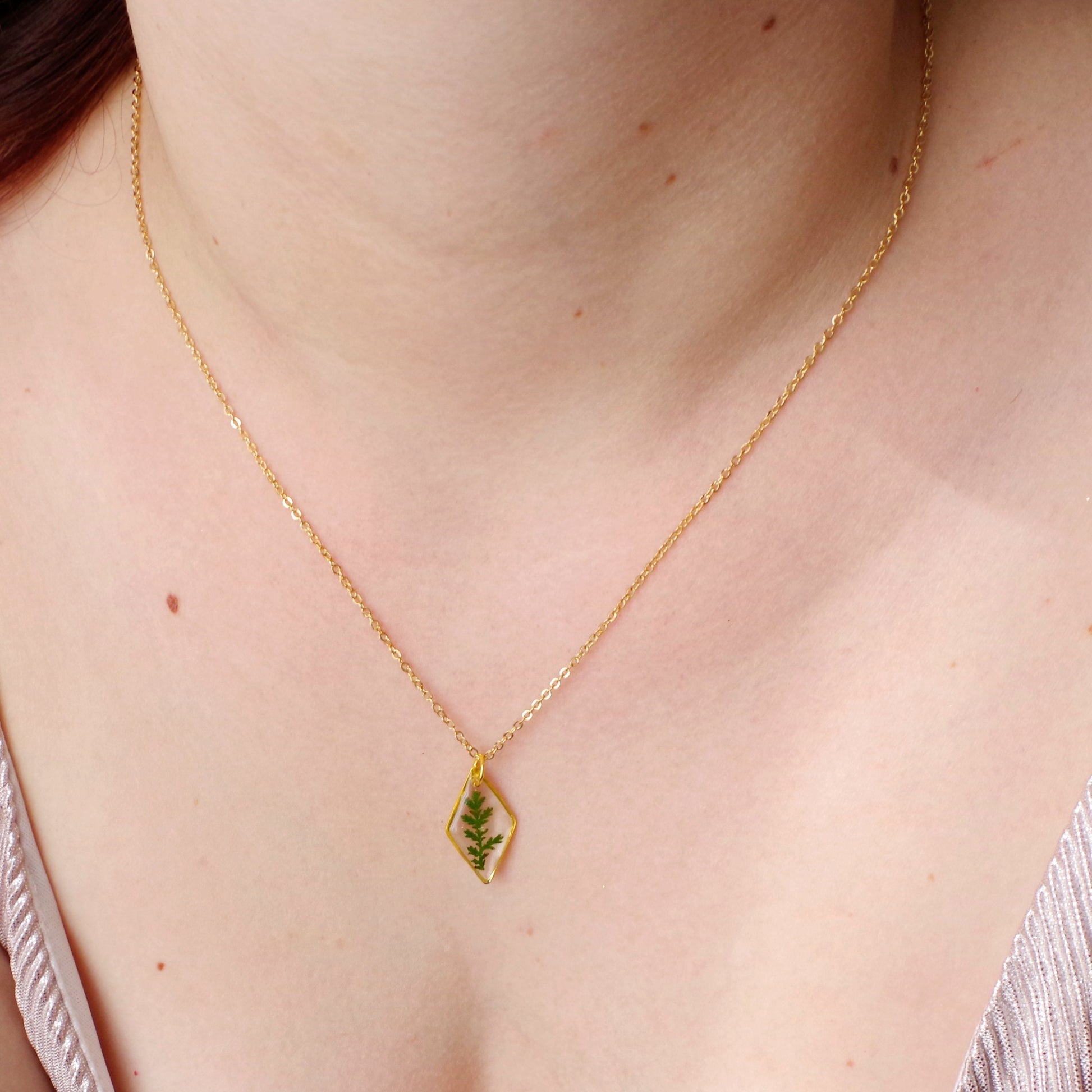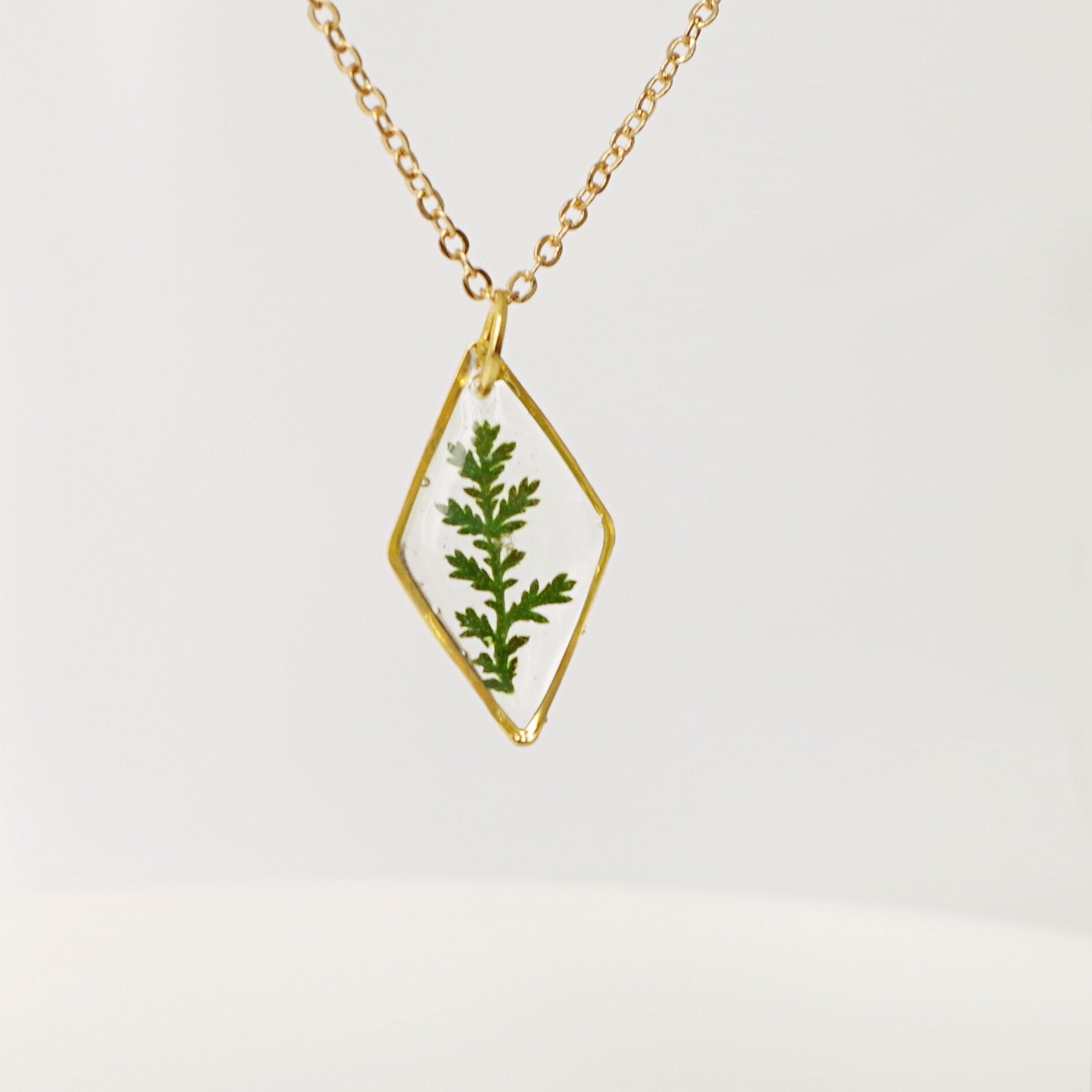 Gold necklace with real pressed fern leaf in resin Terrarium Jewelry An elegant resin necklace with real green hand-picked forest fern. This will be a special gift for a loved one, as ferns symbolize sincerity towards others. If you are giving someone a fern as a gift, you are giving them the hope that they will have confidence, shelters, wealth, and happiness. This is a great plant to give someone that you really care about. Charm size: 24x9mm (0.94 * 0.35 inch) Non-tarnished gold-plated stainless steel chain with an extended chain so you can adjust the length from 20 inches. Real rose necklace: https://www.etsy.com/listing/653553087/real-rose-necklace-real-flower-jewelry?ref=shop_home_active_1 Flower jewelry: https://www.etsy.com/shop/NewJewelleryStory?ref=seller-platform-mcnav§ion_id=22449829 https://www.etsy.com/shop/NewJewelleryStory?ref=seller-platform-mcnav§ion_id=22403224 Purchase the listing below if you want to have your order shipped by priority REGISTERED air mail with TRACKING NUMBER: https://www.etsy.com/listing/236847747/registered-shipping-with-tracking-number?ref=listing-shop-header-1 All items come wrapped individually in a ribboned gift box. Please visit all the items from my shop here: https://www.etsy.com/fr/shop/NewJewelleryStory?ref=hdr_shop_menu Thank you for looking