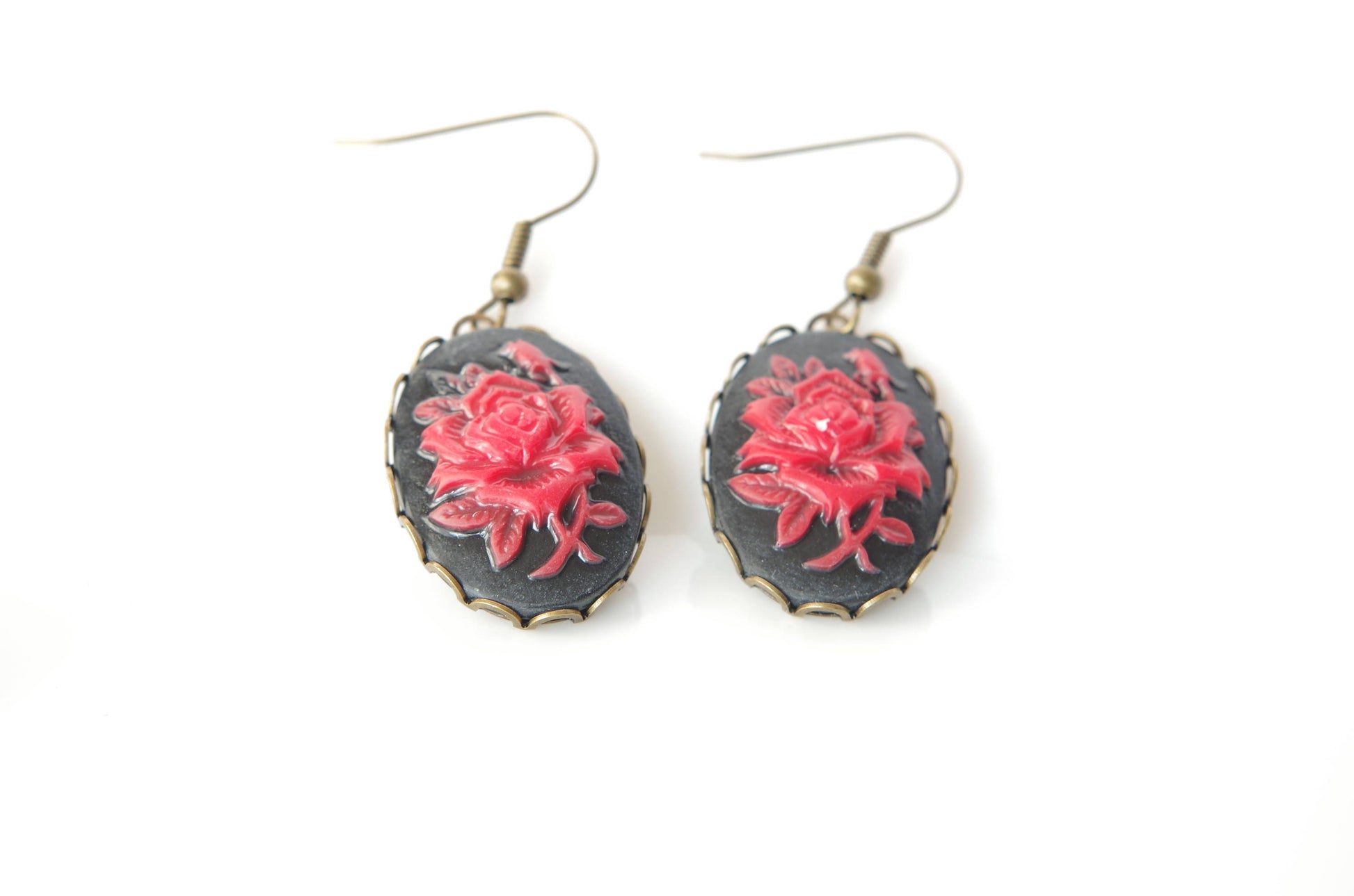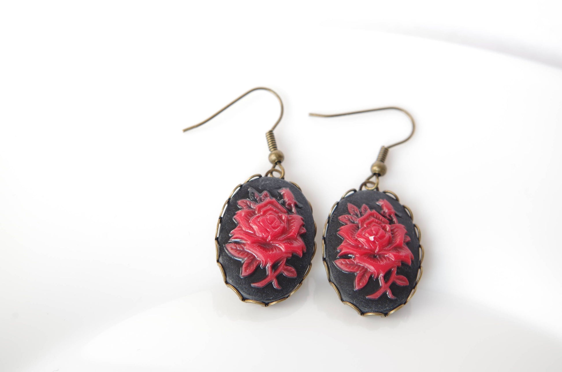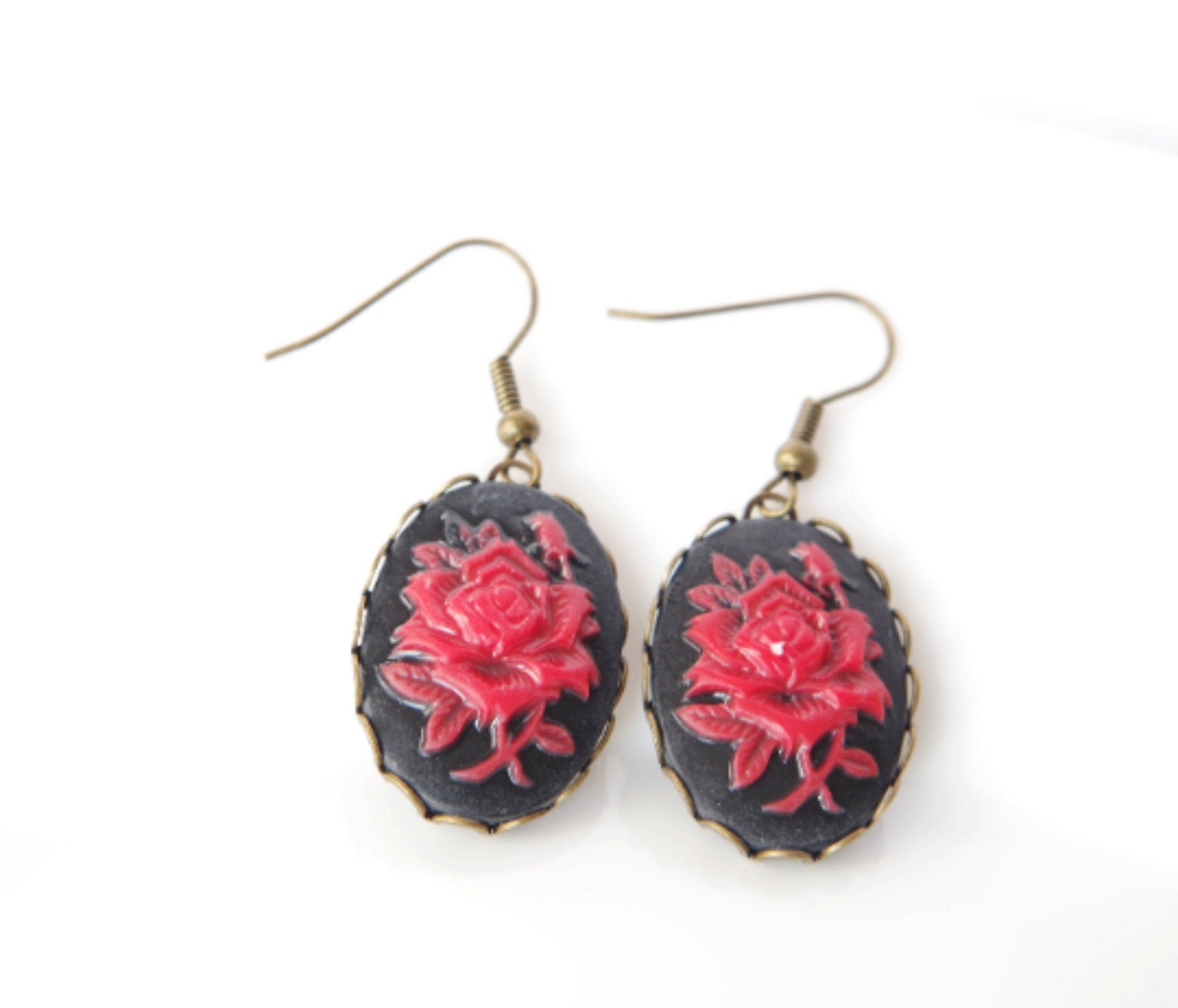 Boucles d’oreilles camée gothique – Rose rouge sur fond noir avec monture bronze