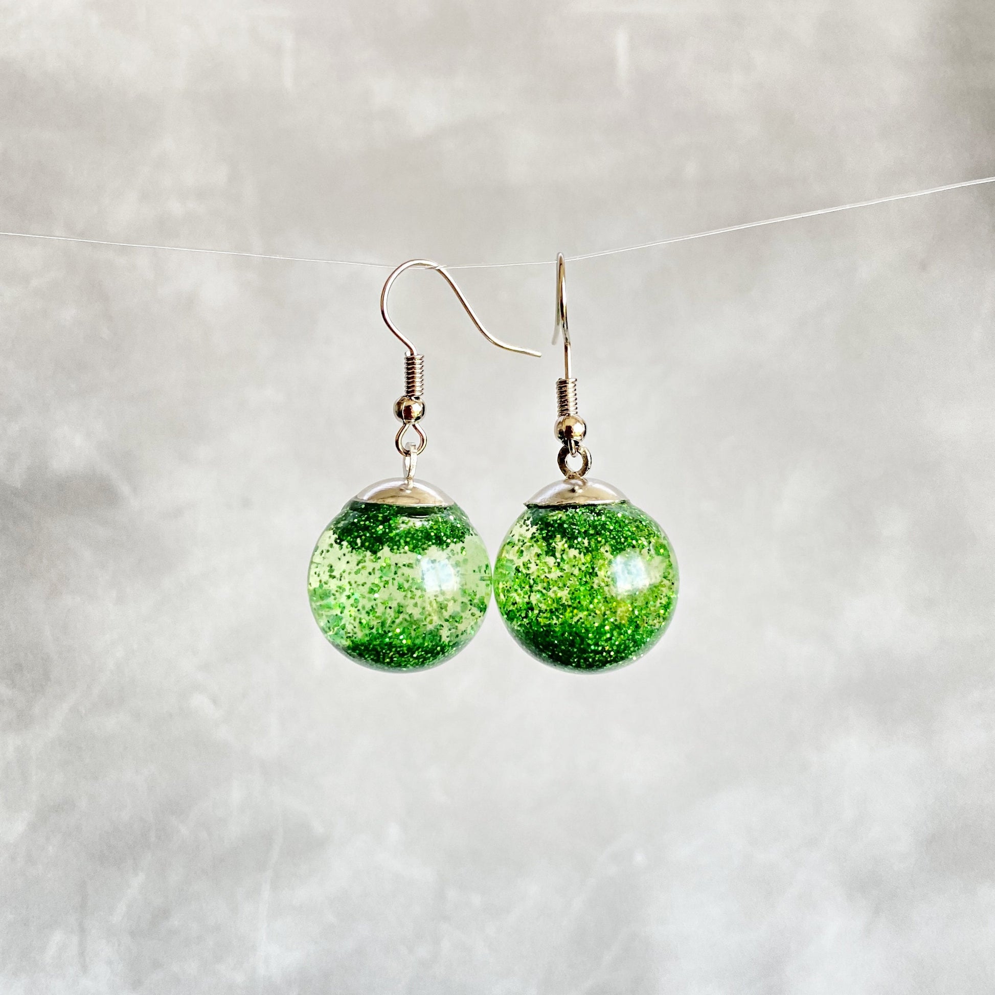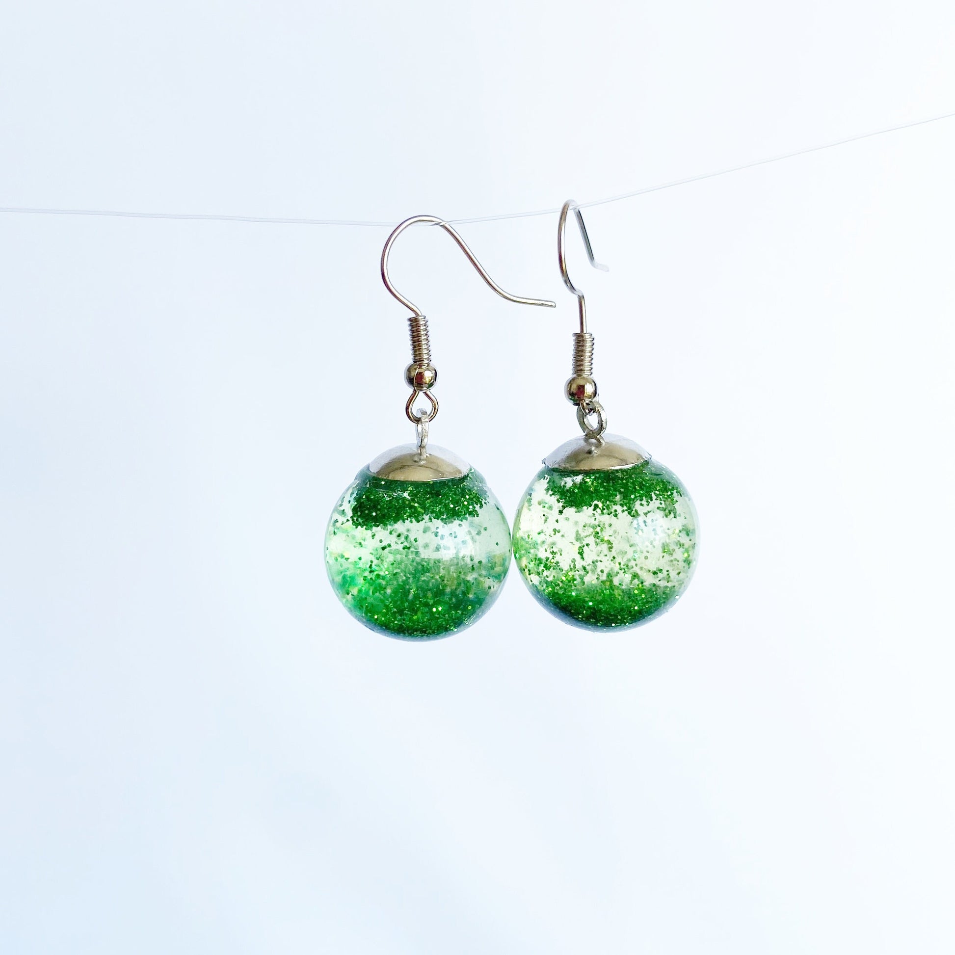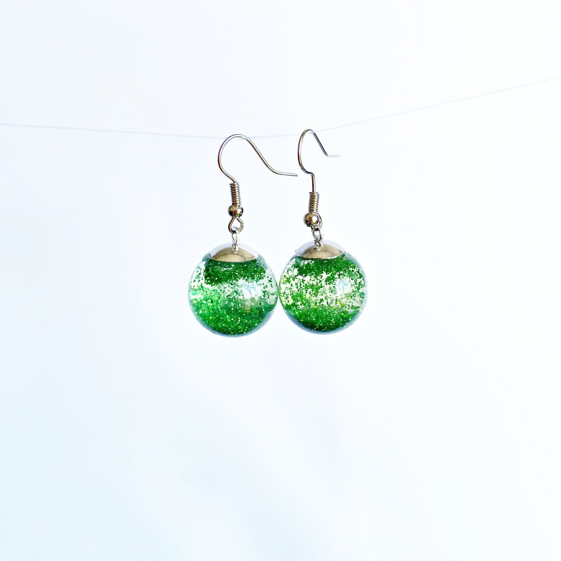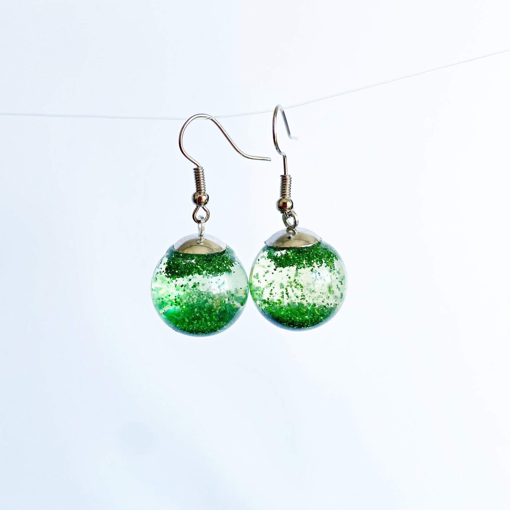 Green sequins floating in a glass bottle earrings .Glass globe filled with water and and sequins.It is winter with falling snowflakes. These earrings are a wonderful Christmas present for mom and friends. Glass Sphere 14 mm ( 1/2") Length Drop Earrings: 25mm ( 1" ) Christmas snow globe necklace : https://www.etsy.com/listing/647205163/winter-pendant-snow-globe-necklace?ref=shop_home_active_42&pro=1&frs=1 https://www.etsy.com/listing/645873423/fairy-magic-necklace-rainbow-orb-glass?ref=shop_home_active_68&pro=1&frs=1 All items come wrapped individually in a ribboned gift box. Please visit all the items from my chop here . https://www.etsy.com/shop/NewJewelleryStory?ref=hdr_shop_menu Thank you for looking