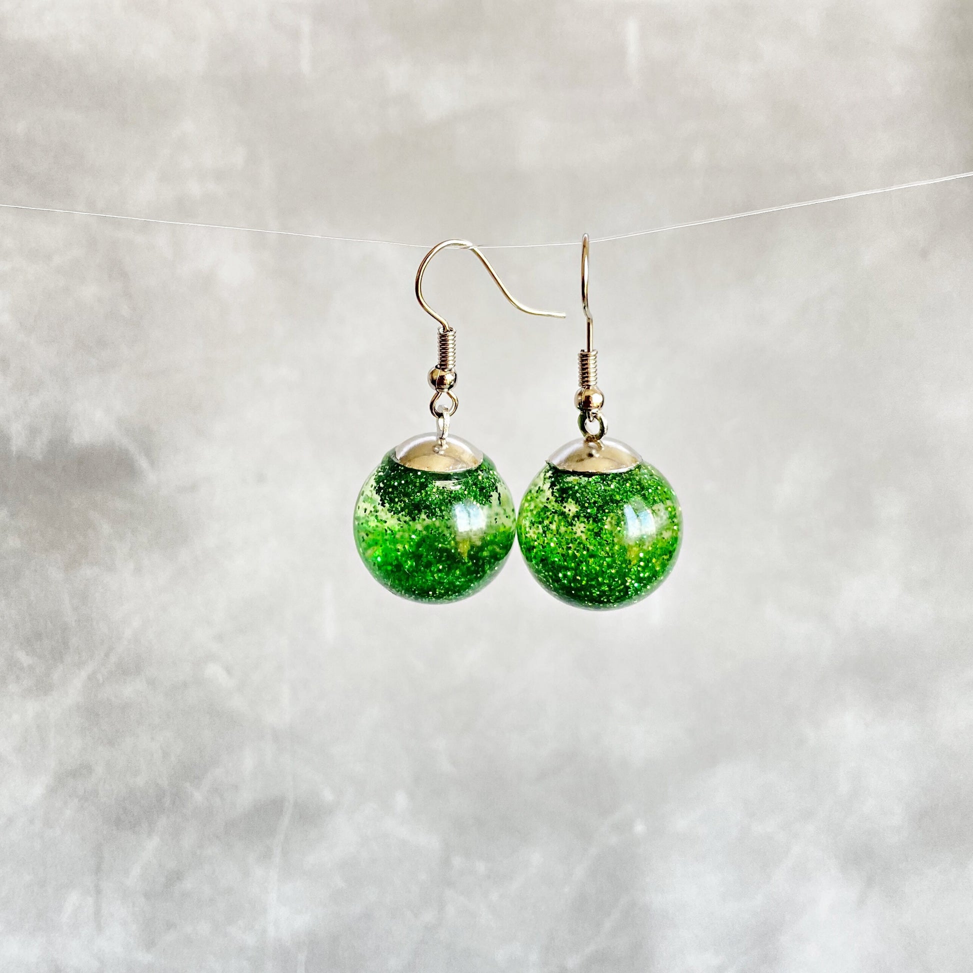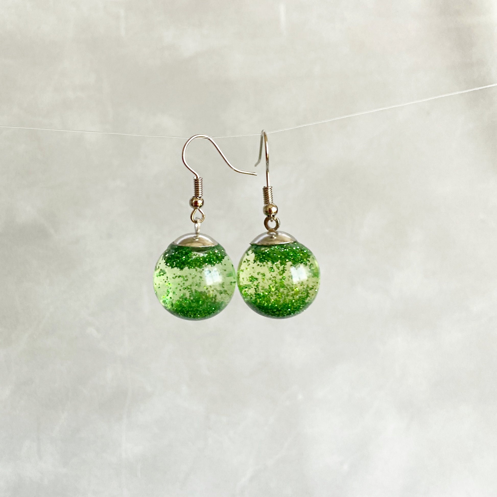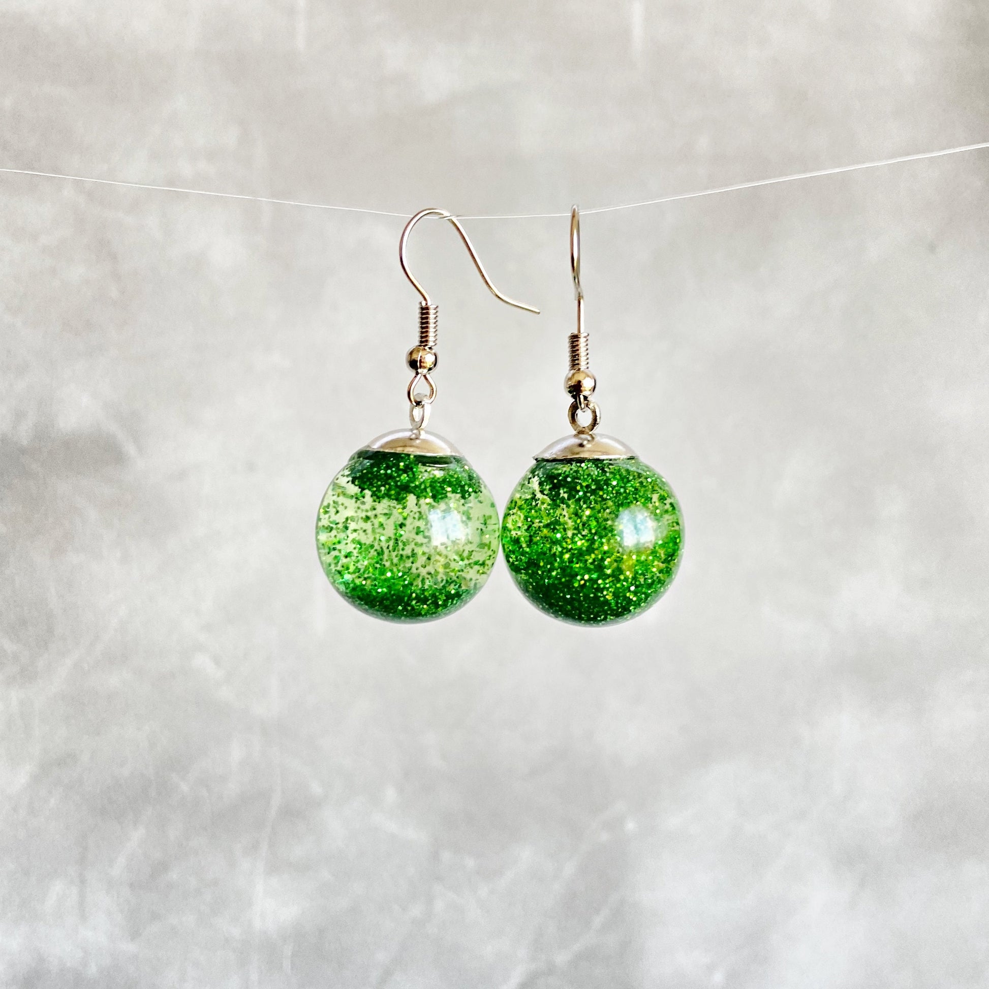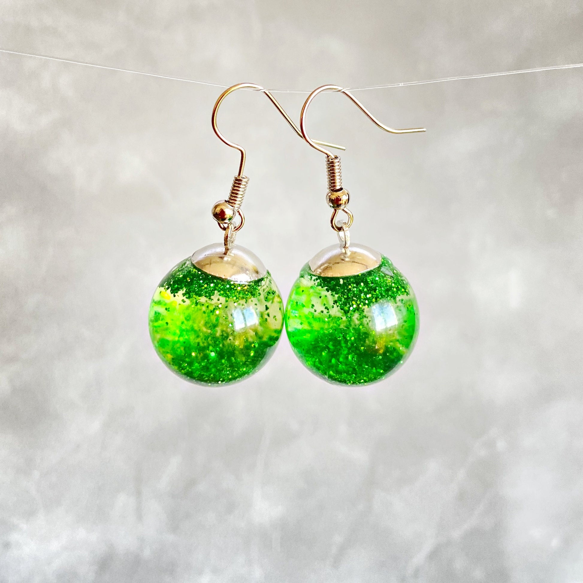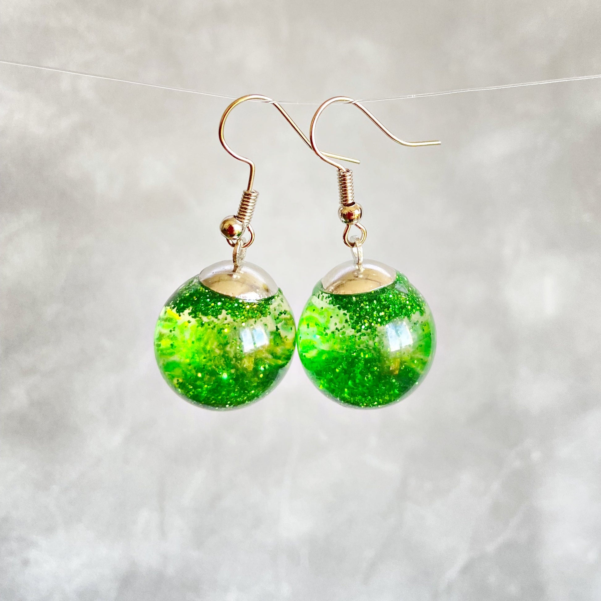 Green sequins floating in a glass bottle earrings .Glass globe filled with water and and sequins.It is winter with falling snowflakes. These earrings are a wonderful Christmas present for mom and friends. Glass Sphere 14 mm ( 1/2") Length Drop Earrings: 25mm ( 1" ) Christmas snow globe necklace : https://www.etsy.com/listing/647205163/winter-pendant-snow-globe-necklace?ref=shop_home_active_42&pro=1&frs=1 https://www.etsy.com/listing/645873423/fairy-magic-necklace-rainbow-orb-glass?ref=shop_home_active_68&pro=1&frs=1 All items come wrapped individually in a ribboned gift box. Please visit all the items from my chop here . https://www.etsy.com/shop/NewJewelleryStory?ref=hdr_shop_menu Thank you for looking