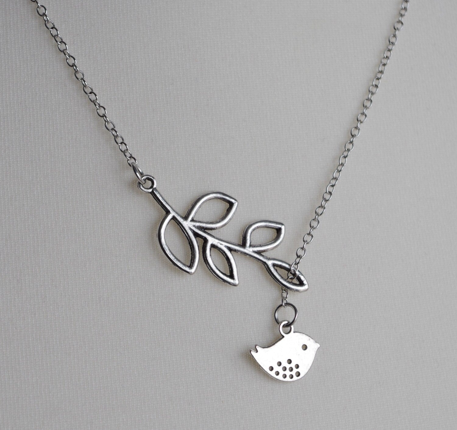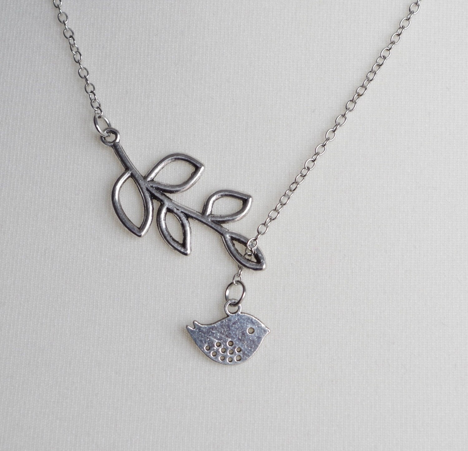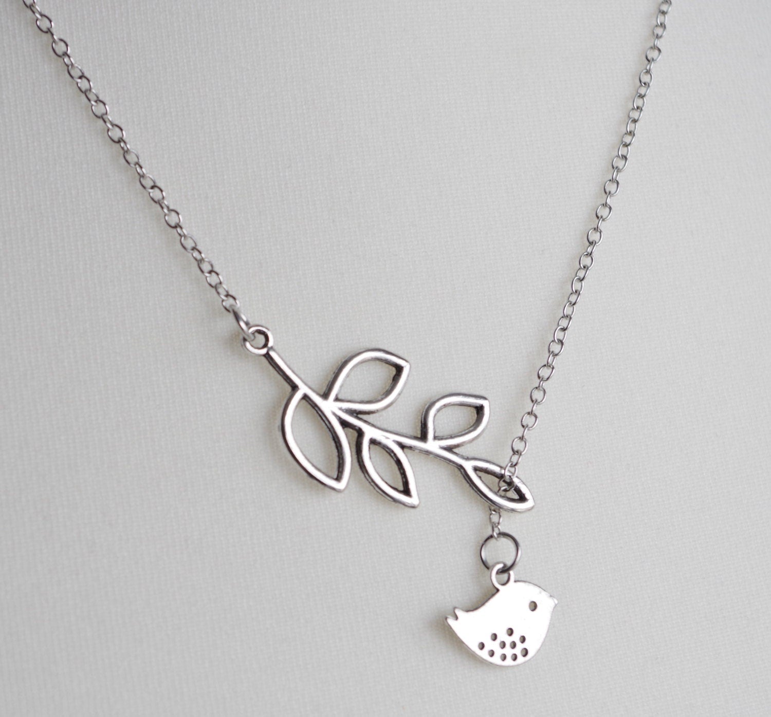 Mothers Day Gift Bird and Branch Lariat Necklace Leaf Pendant Necklace Bird charm Bridal necklace Wedding jewelry Christmas gift