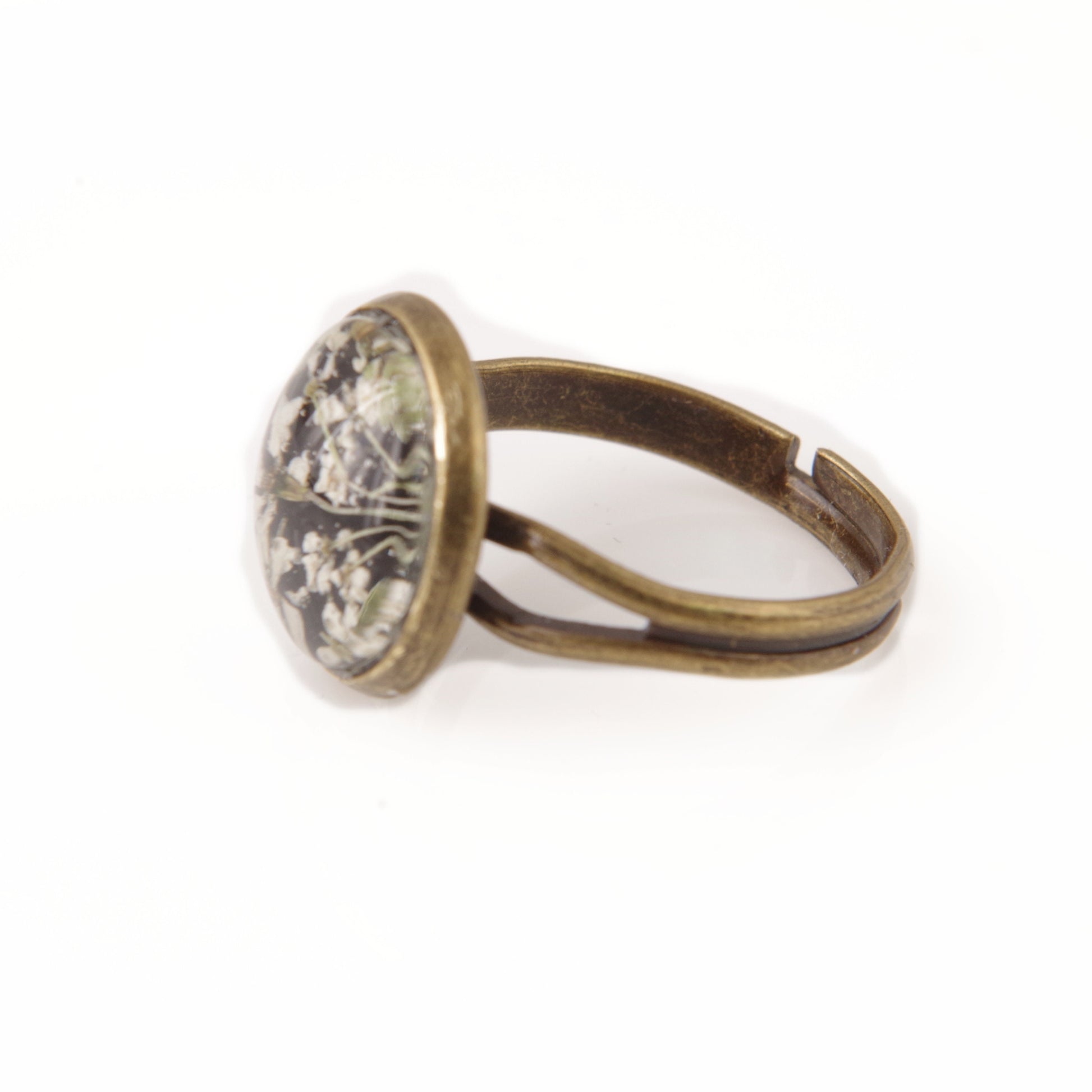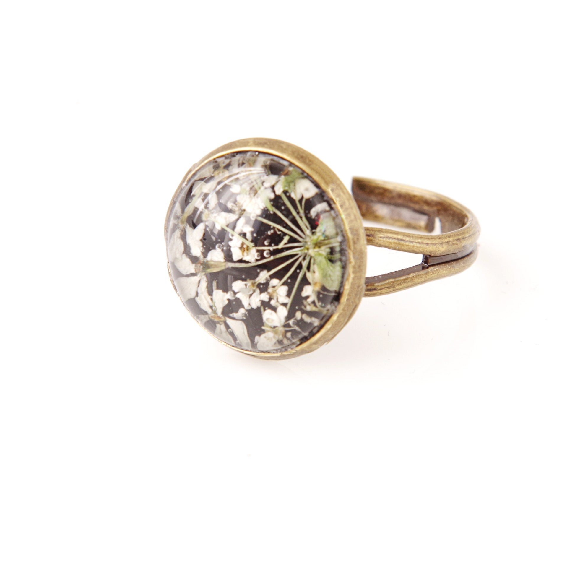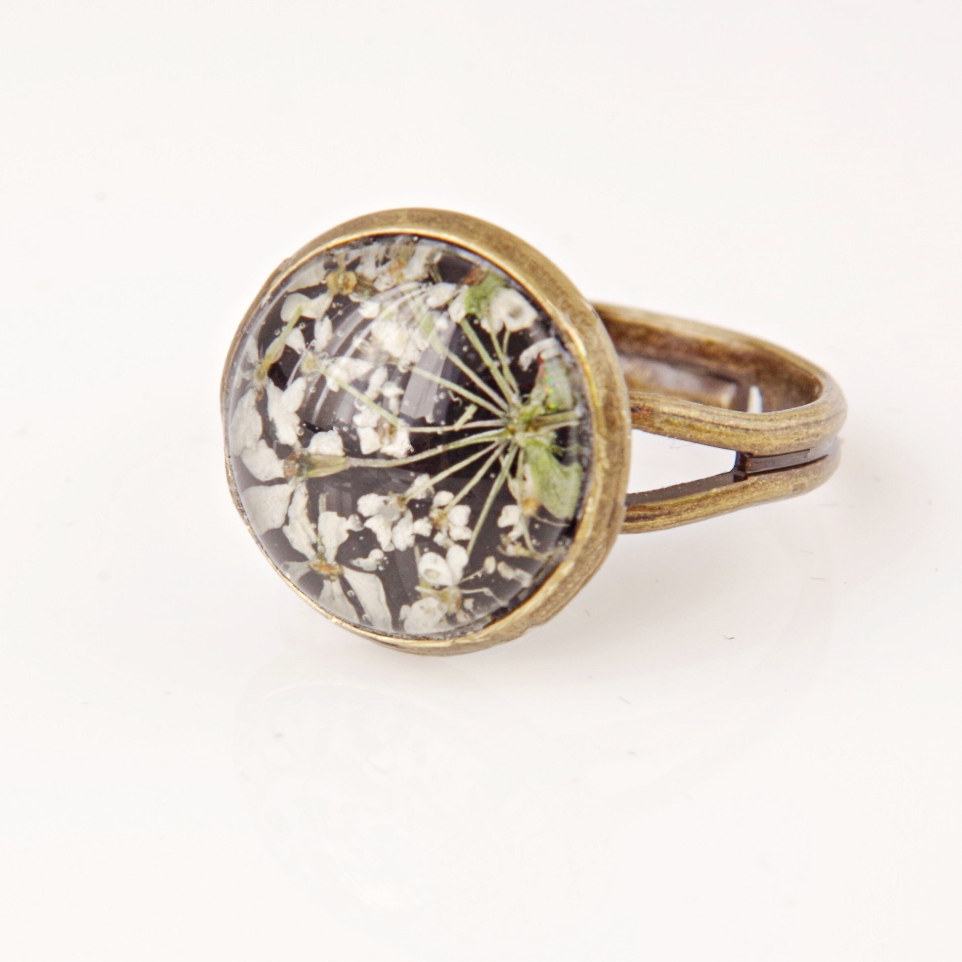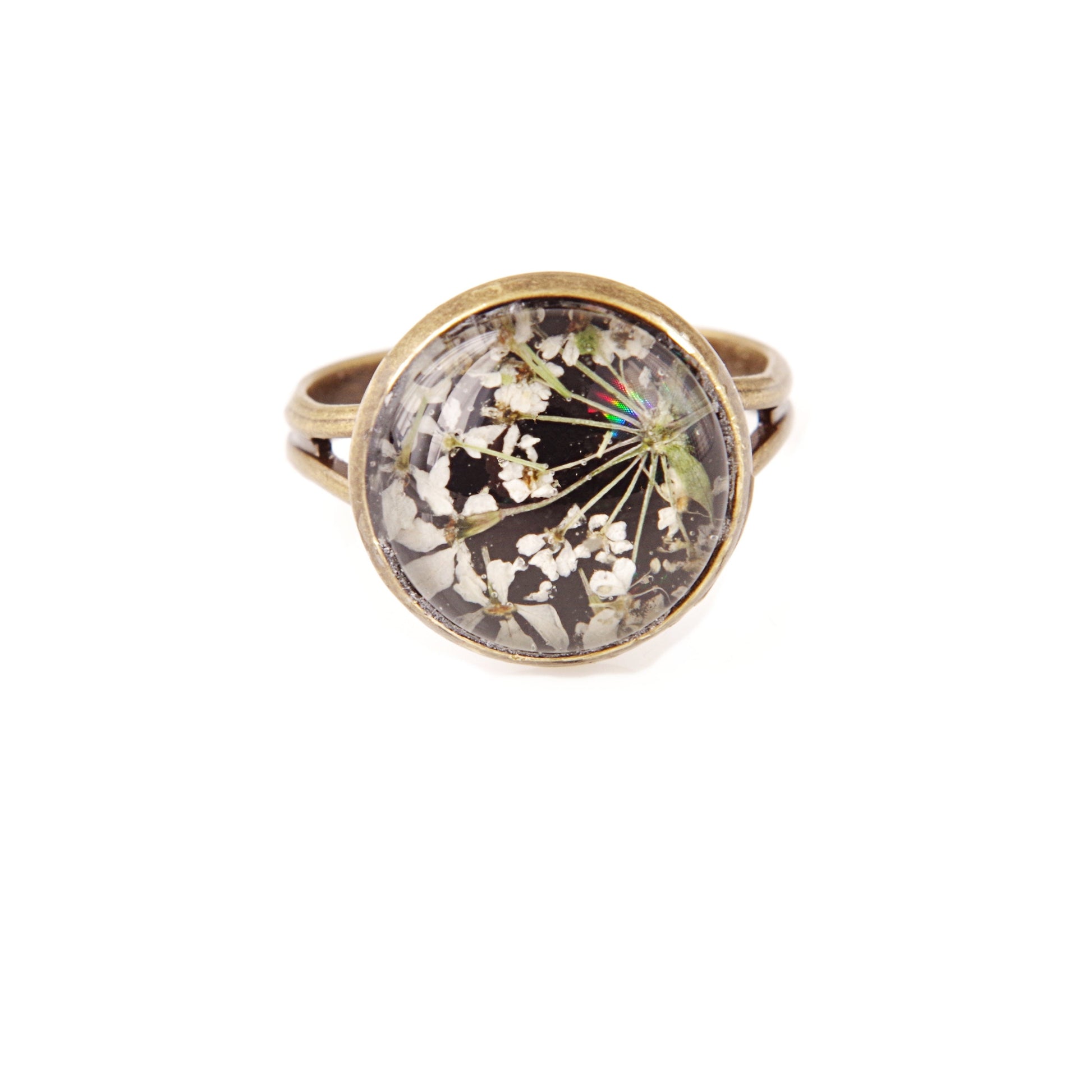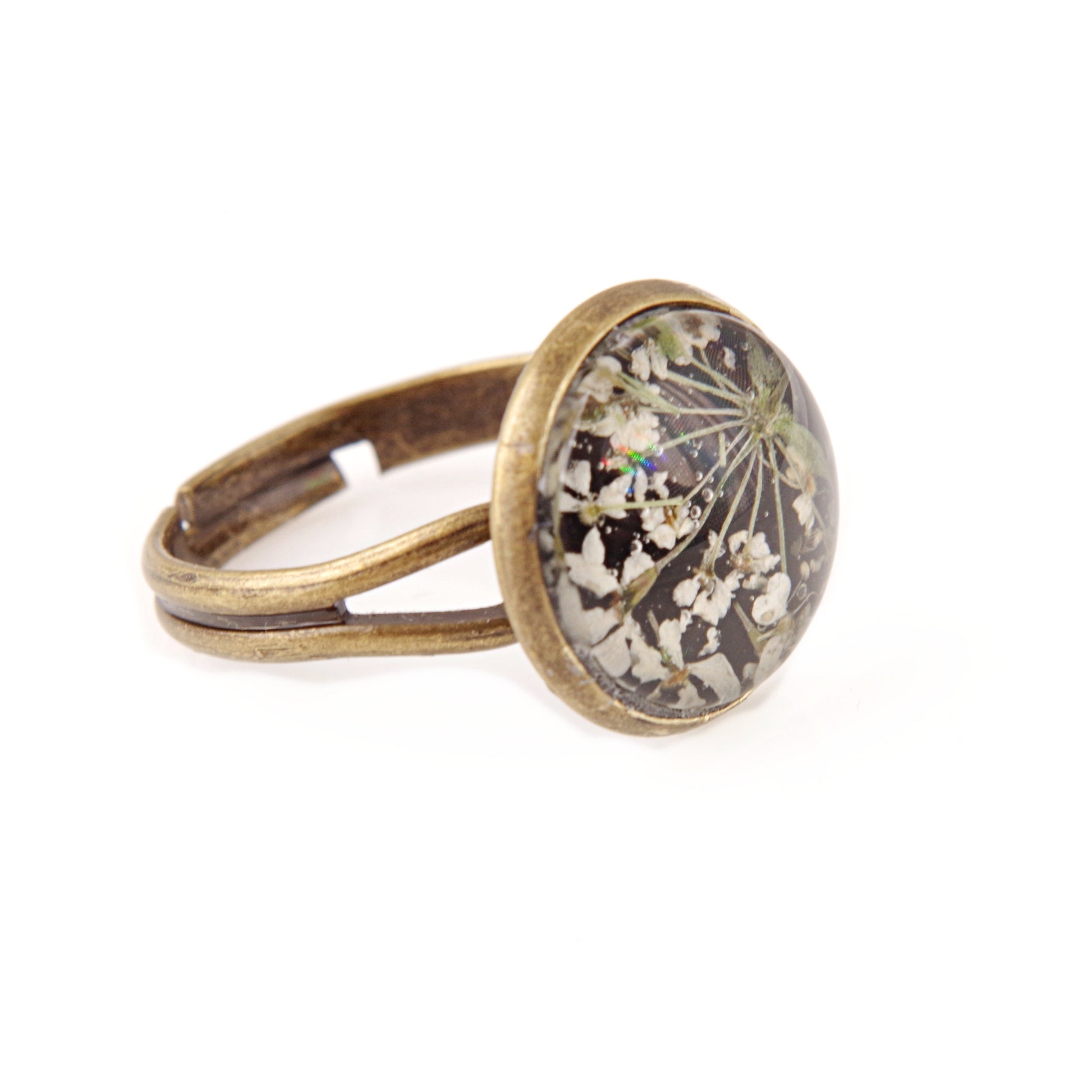 Pressed flower in terrarium ring gift for women ,mom ,sister . Queen Anne’s lace is a beautiful flower embedded in that fashionable ring . There is a piece of nature within it. The ring is a half sphere and is 1 centimeters in diameter. Very romantic and delicate ring gift for her ,mom , grandma. Photos are example of the product. Cabochon can vary slightly, because in nature there are no two the same flowers. A plant is locked in a resin forever. Each jewelry in our shop is made by hand and not a machine so tiny bubbles, bumps and waves and slight imperfections are part of the unique characteristics of the jewelry. Blue flowers ring : https://www.etsy.com/listing/241759274/real-flower-ring-blue-flowers-ring?ref=shop_home_active_12 Antique bronze Adjustable ring Pressed flower: https://www.etsy.com/listing/241656395/real-flower-ring-blue-cream-flowers-ring?ref=shop_home_active_14 All jewelry items will come to you nicely packaged in a gift box. Please visit all the items from my shop here: https://www.etsy.com/fr/shop/NewJewelleryStory?ref=hdr_shop_menu Thank you for looking