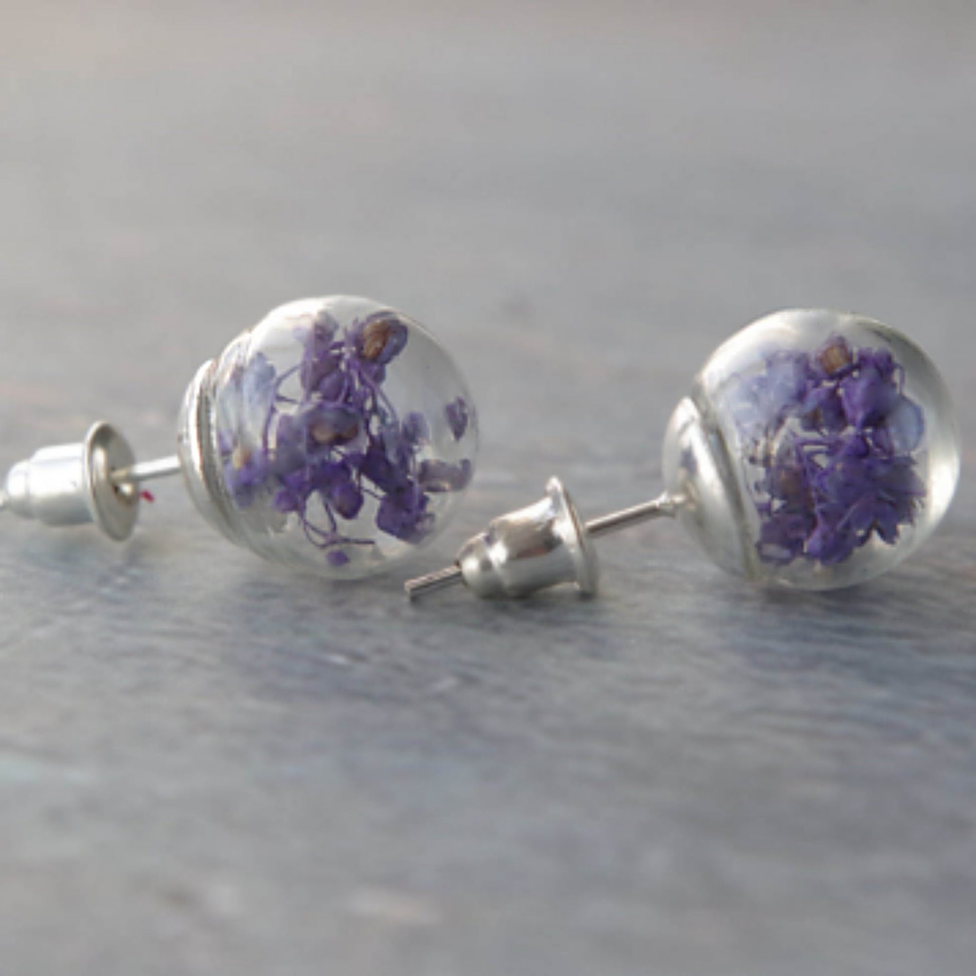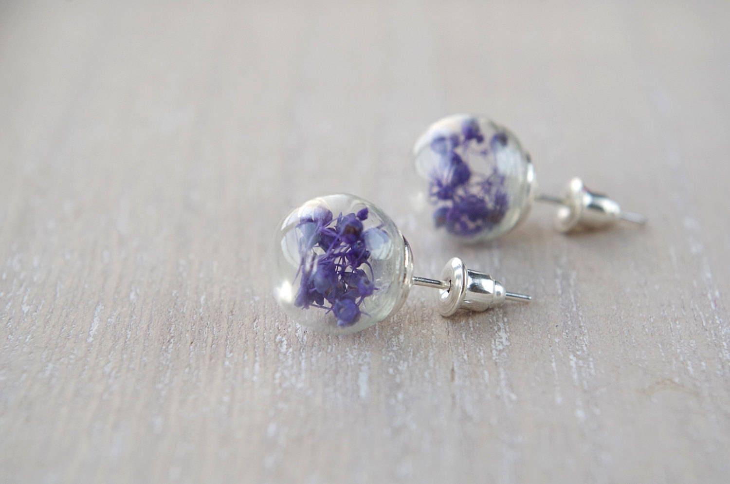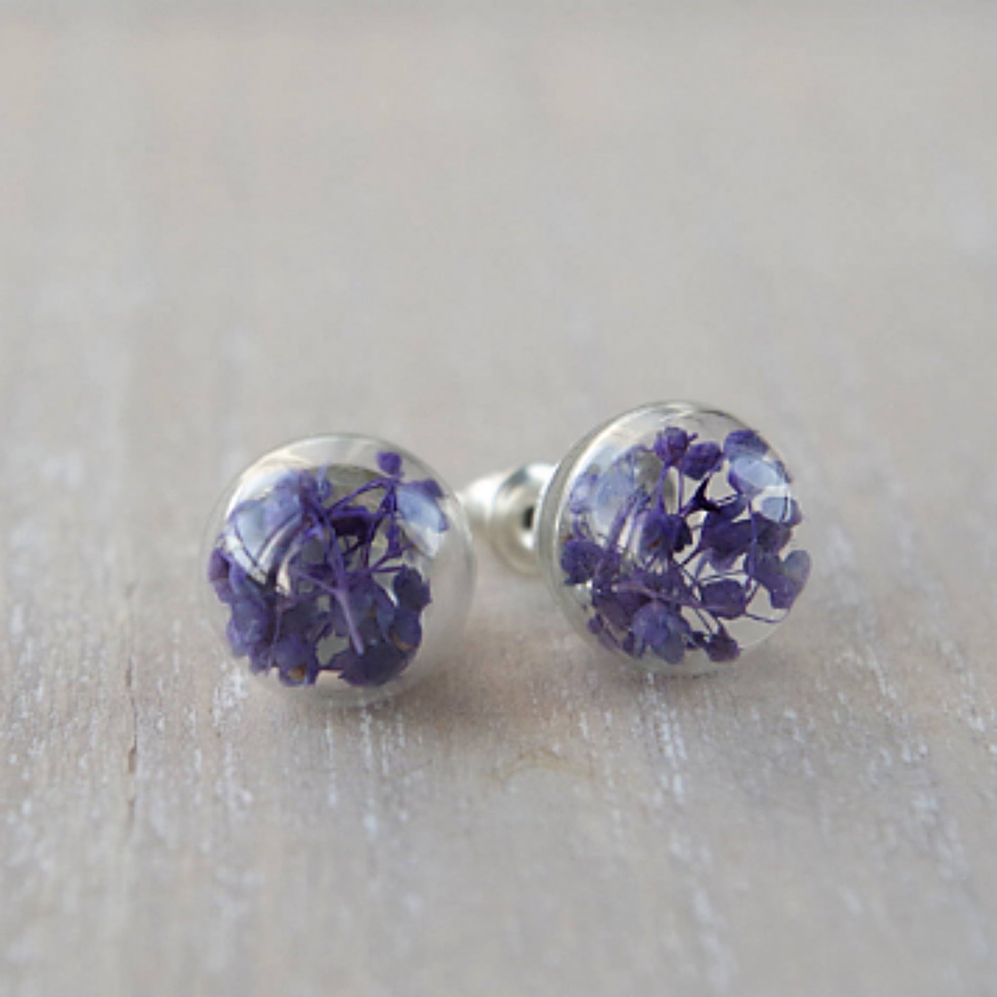 Purple flower stud earrings small real flower earrings natural flower jewelry botanical glass globe birthday gift Mother's Day gift