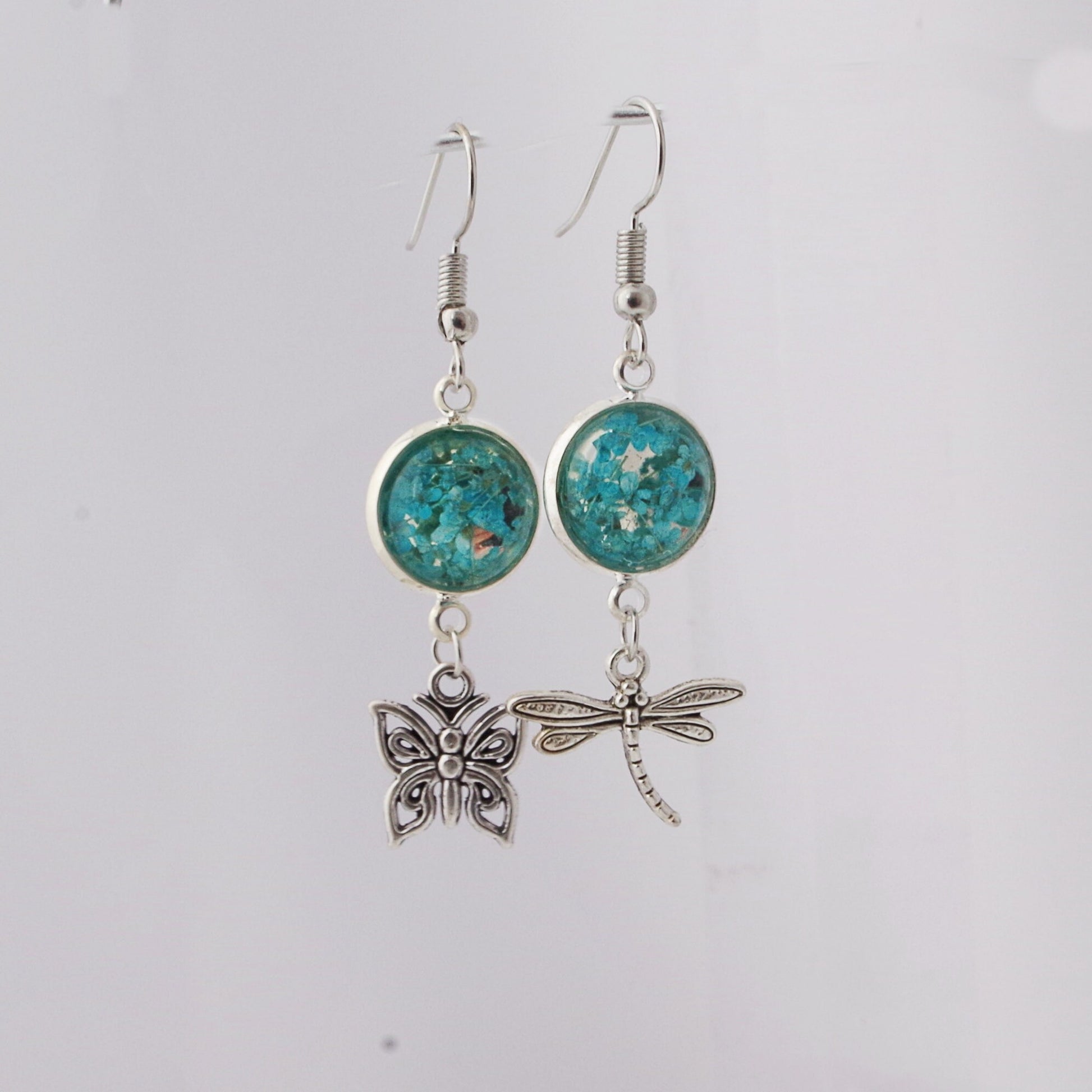 Real flower earrings . These romantic real flower earrings are a perfect gift for women! Teal flowers are captured forever in transparent resin, and reveal their delicate beauty in a 3-dimensional way, slightly enlarged by the dome shaped cabochon. The flower cabochons are 12 mm = 0, 47 ", Length of the drop earring : 2 inches (5 cm) Even more stars jewelry : https://www.etsy.com/shop/NewJewelleryStory?ref=l2-shopheader-name&section_id=23653456 PACKAGING: All items are boxed and carefully wrapped up to ensure a safe delivery. The box is very elegant and it ready to give as a gift. All items come wrapped individually in a ribboned gift box. Please visit all the items from my shop here: https://www.etsy.com/fr/shop/NewJewelleryStory?ref=hdr_shop_menu Thank you for looking