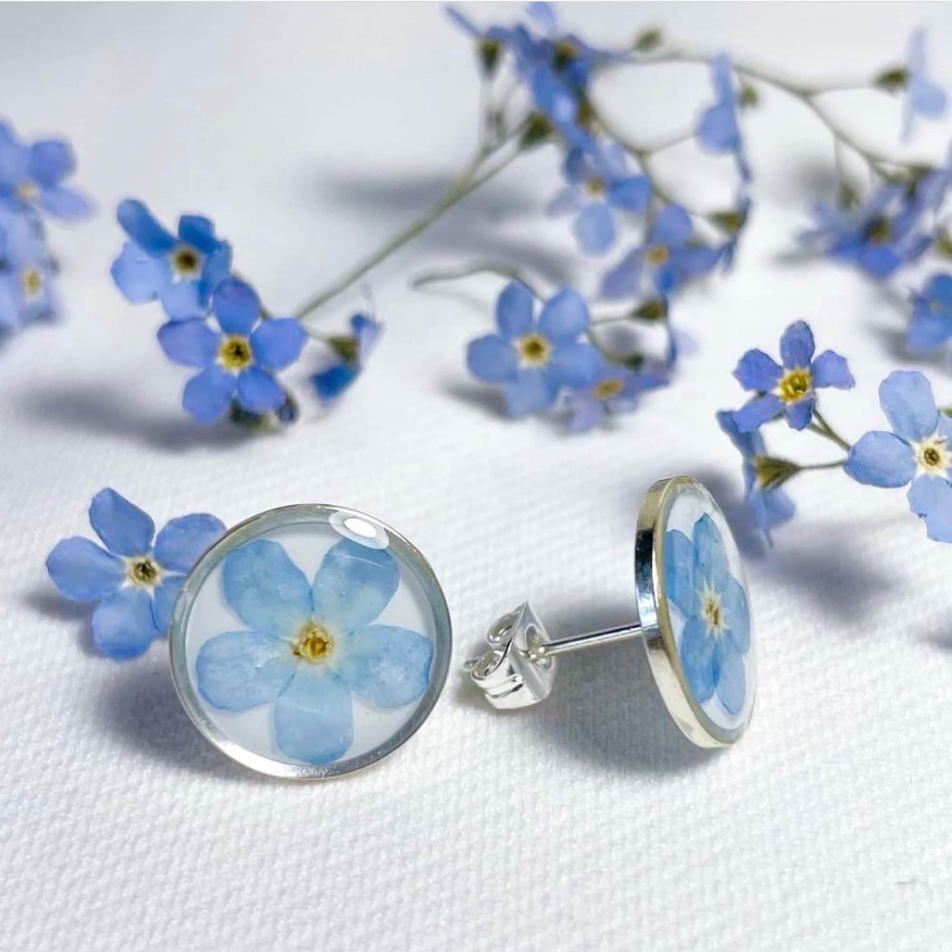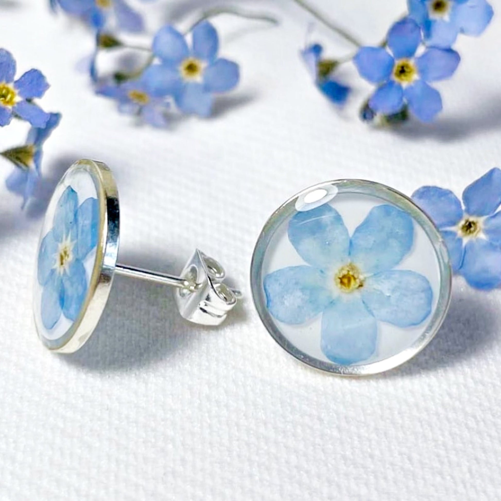 These lovely stud earrings are made with Real Forget me Not flower. The petals have been carefully preserved to retain their color, and sealed with a resin, so you don't need to worry about them decaying. They are delicate and ideal as a gift for Nature Love. The Forget me Not flower represents true love and giving someone this flower means you truly love and respect this person. You can always give it to your partner to show your true emotions. The forget me not flower is a symbol of fidelity and being truthful to someone you love. Forget Me Not jewelry: https://www.etsy.com/shop/NewJewelleryStory?ref=seller-platform-mcnav§ion_id=24437926 Dandelion jewelry: https://www.etsy.com/shop/NewJewelleryStory?ref=seller-platform-mcnav§ion_id=22403224 Real flower jewelry: https://www.etsy.com/shop/NewJewelleryStory?ref=seller-platform-mcnav§ion_id=22449829 All items come wrapped individually in a ribboned gift box. Please visit all the items from my shop here: https://www.etsy.com/fr/shop/NewJewelleryStory?ref=hdr_shop_menu