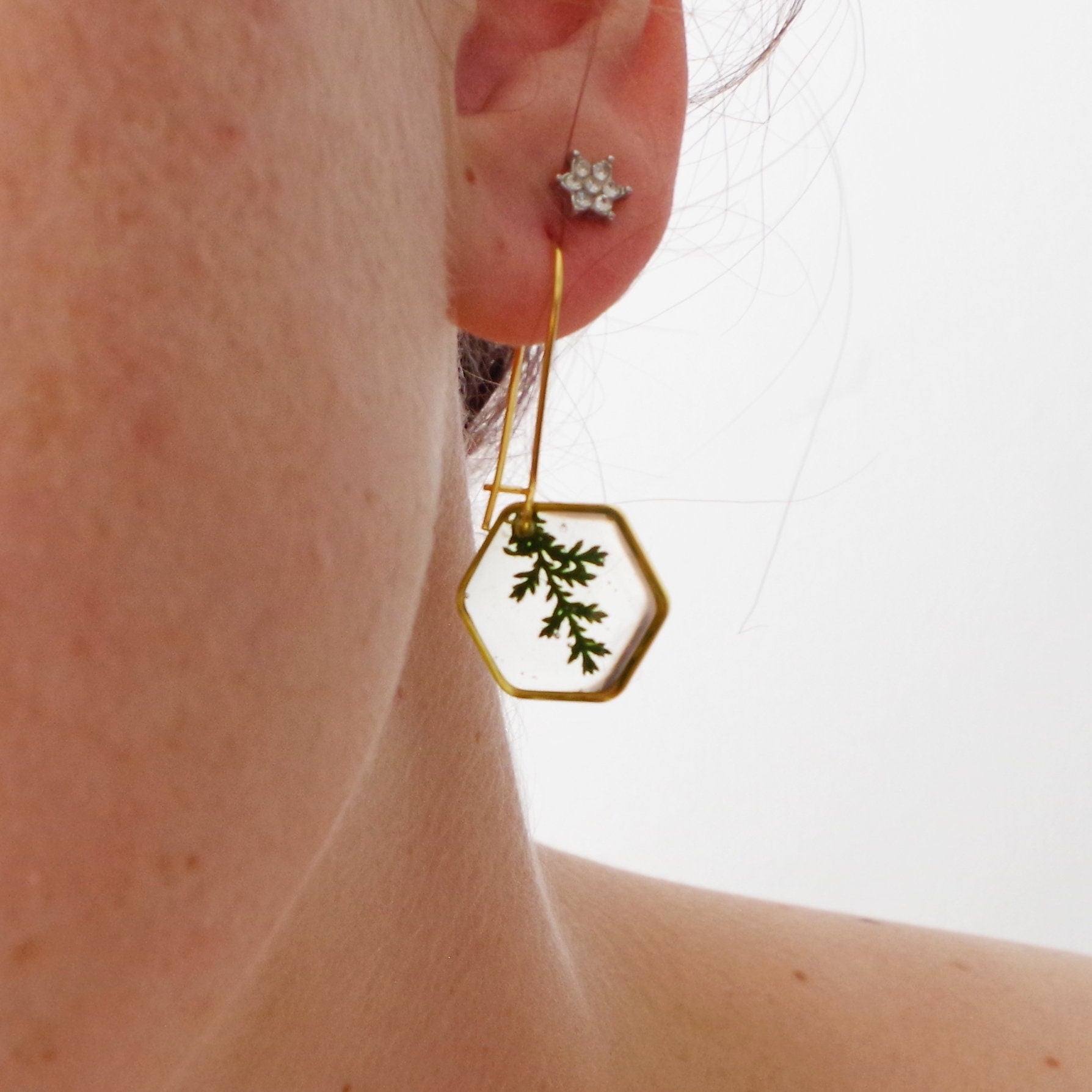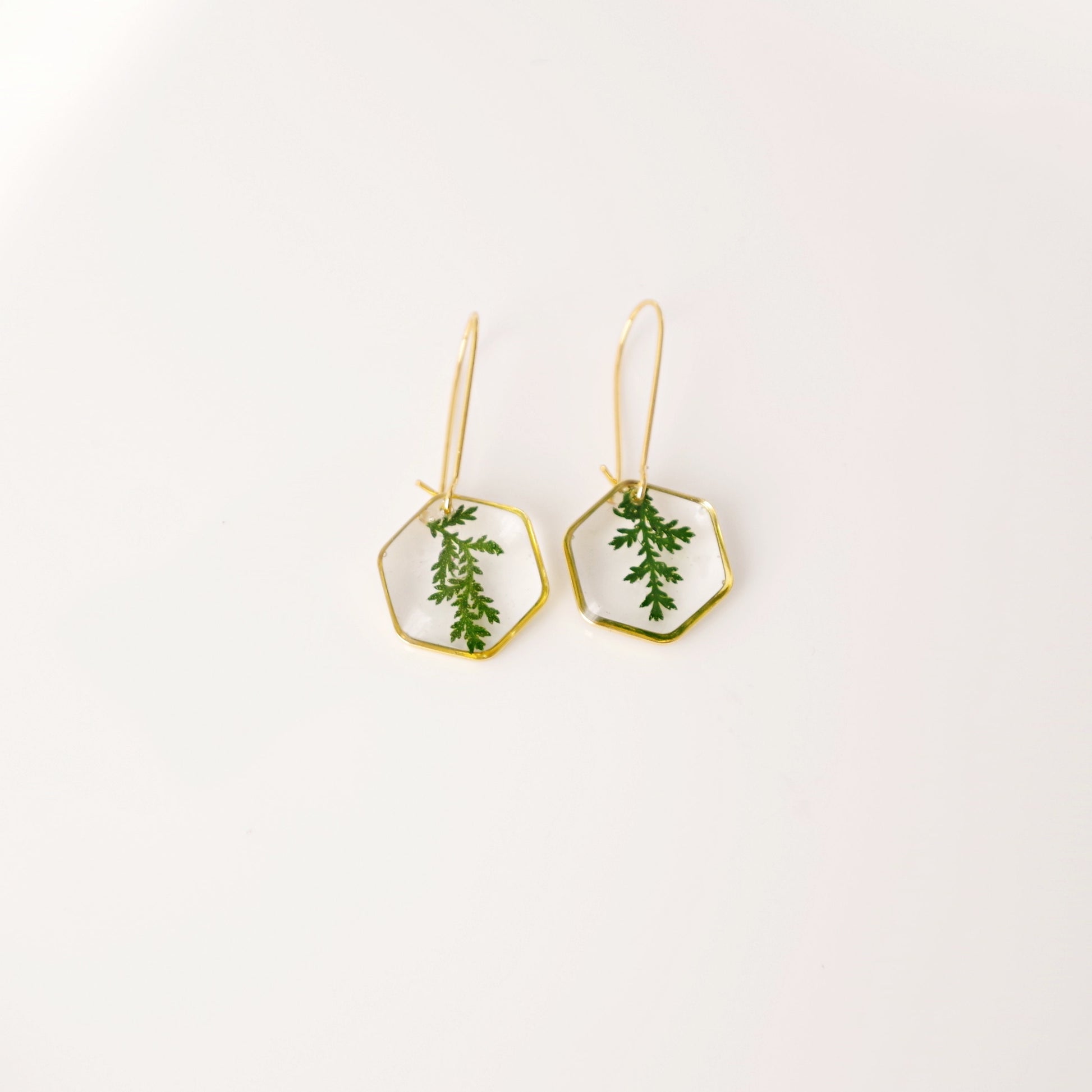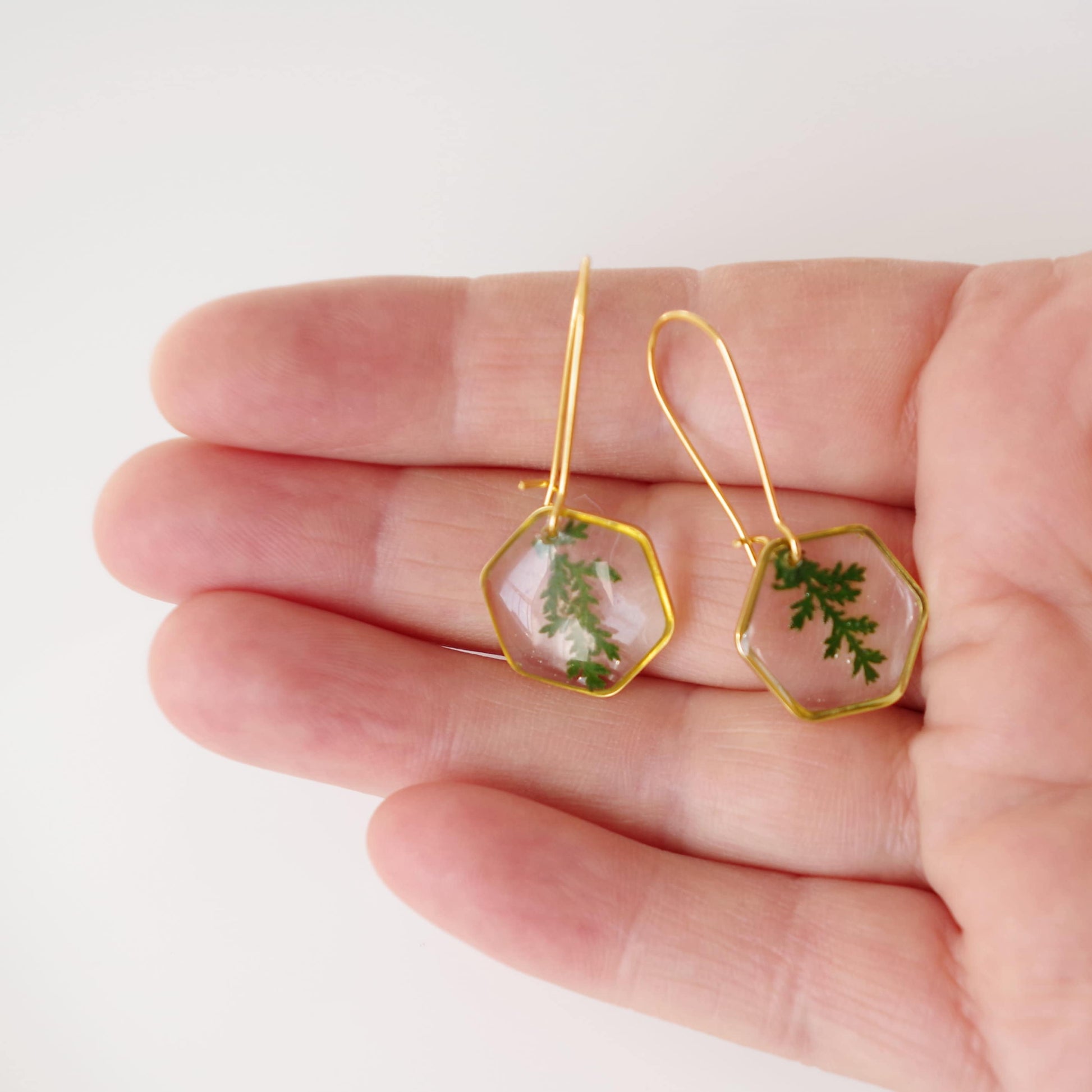 An elegant resin earrings with real green hand-picked forest fern. This will be a special gift for a loved one, as ferns symbolize sincerity towards others. If you are giving someone a fern as a gift, you are giving them the hope that they will have confidence, shelters, wealth, and happiness. This is a great plant to give someone that you really care about.