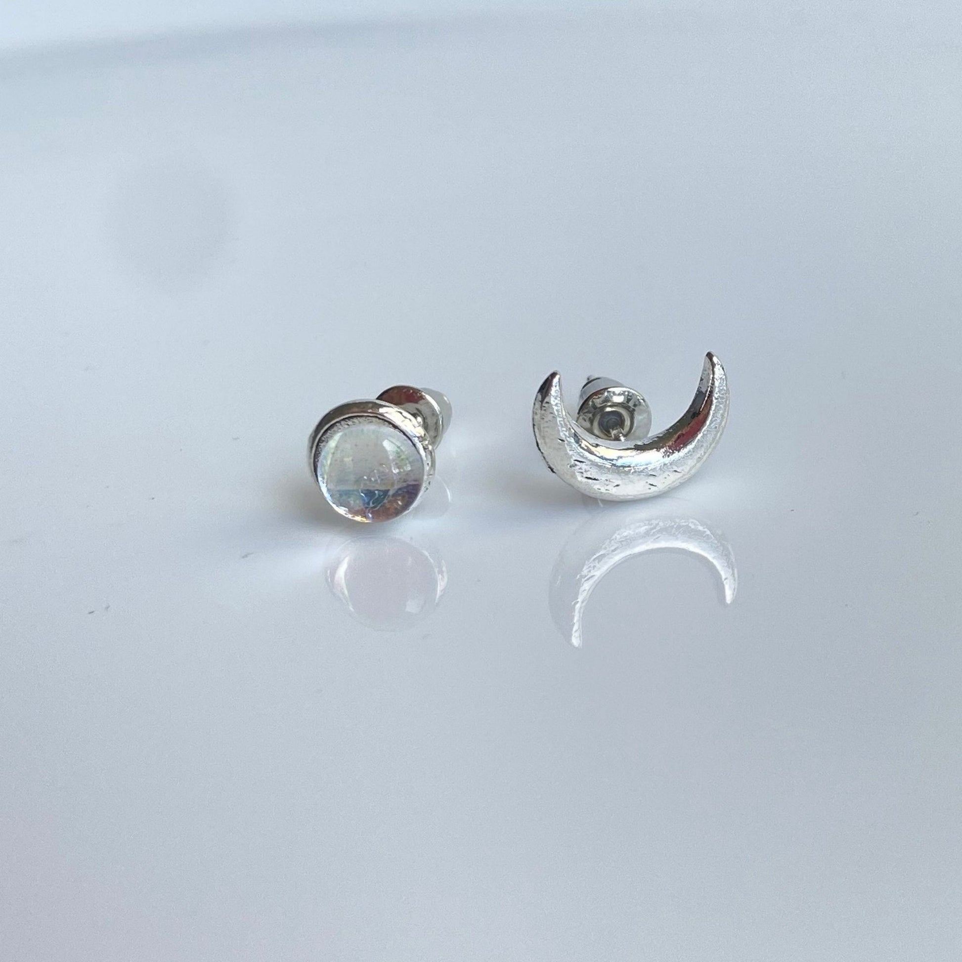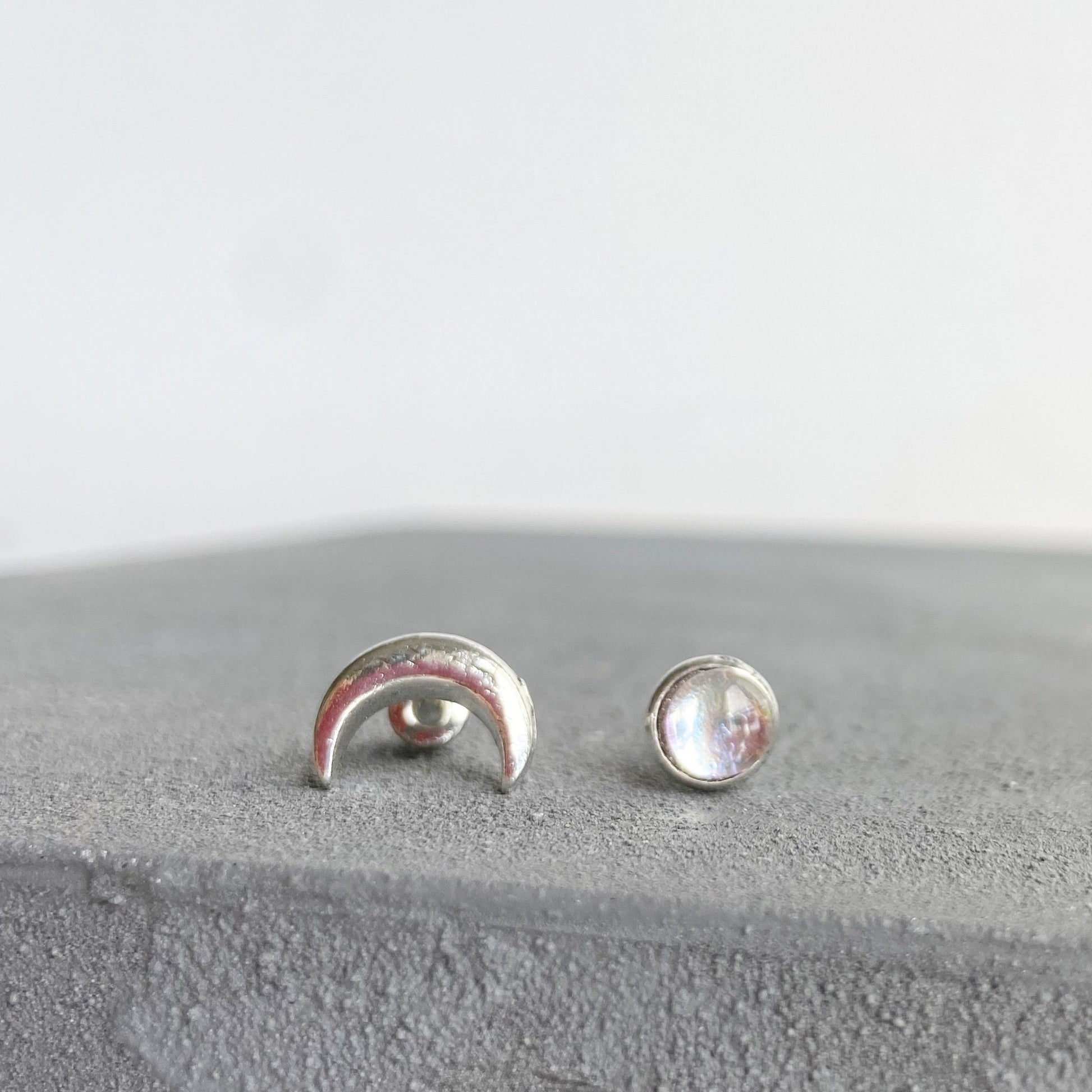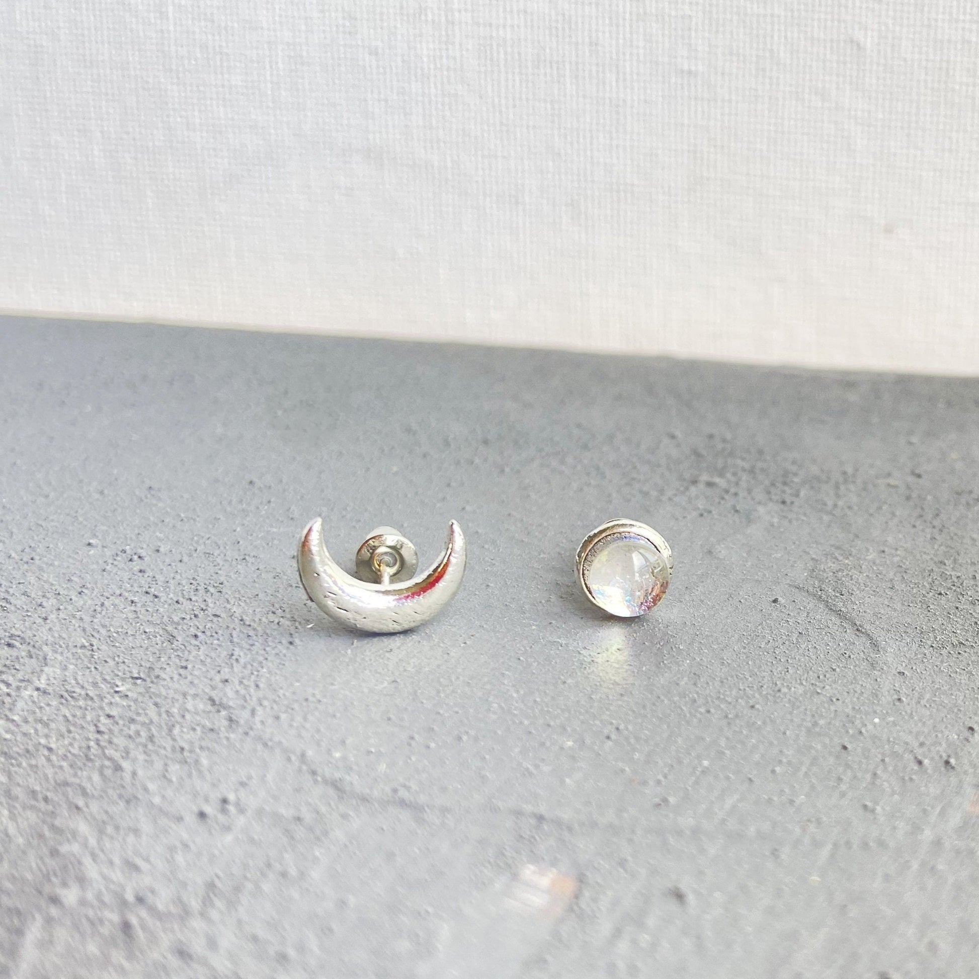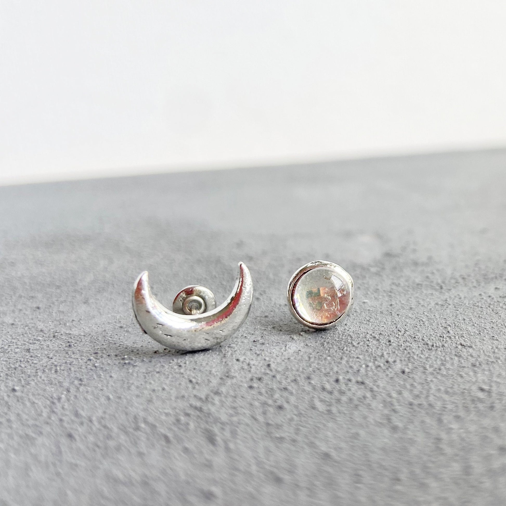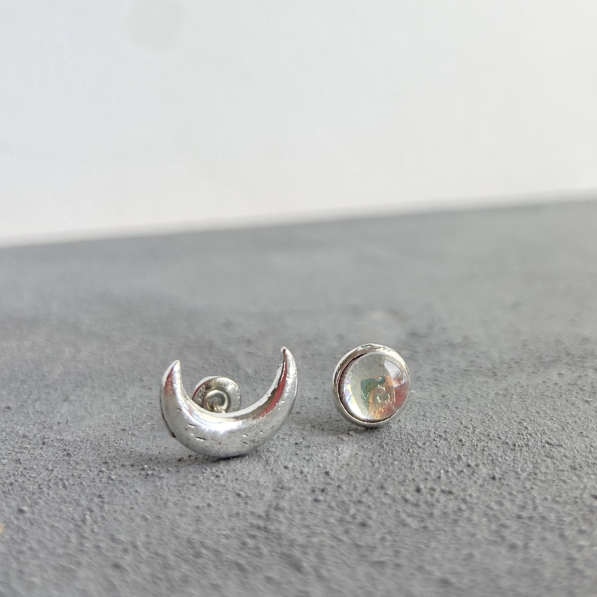 Tiny Moon and moonstone mismatched stud earrings , Celestial jewelry for women , Minimalist Crescent Moon Earrings