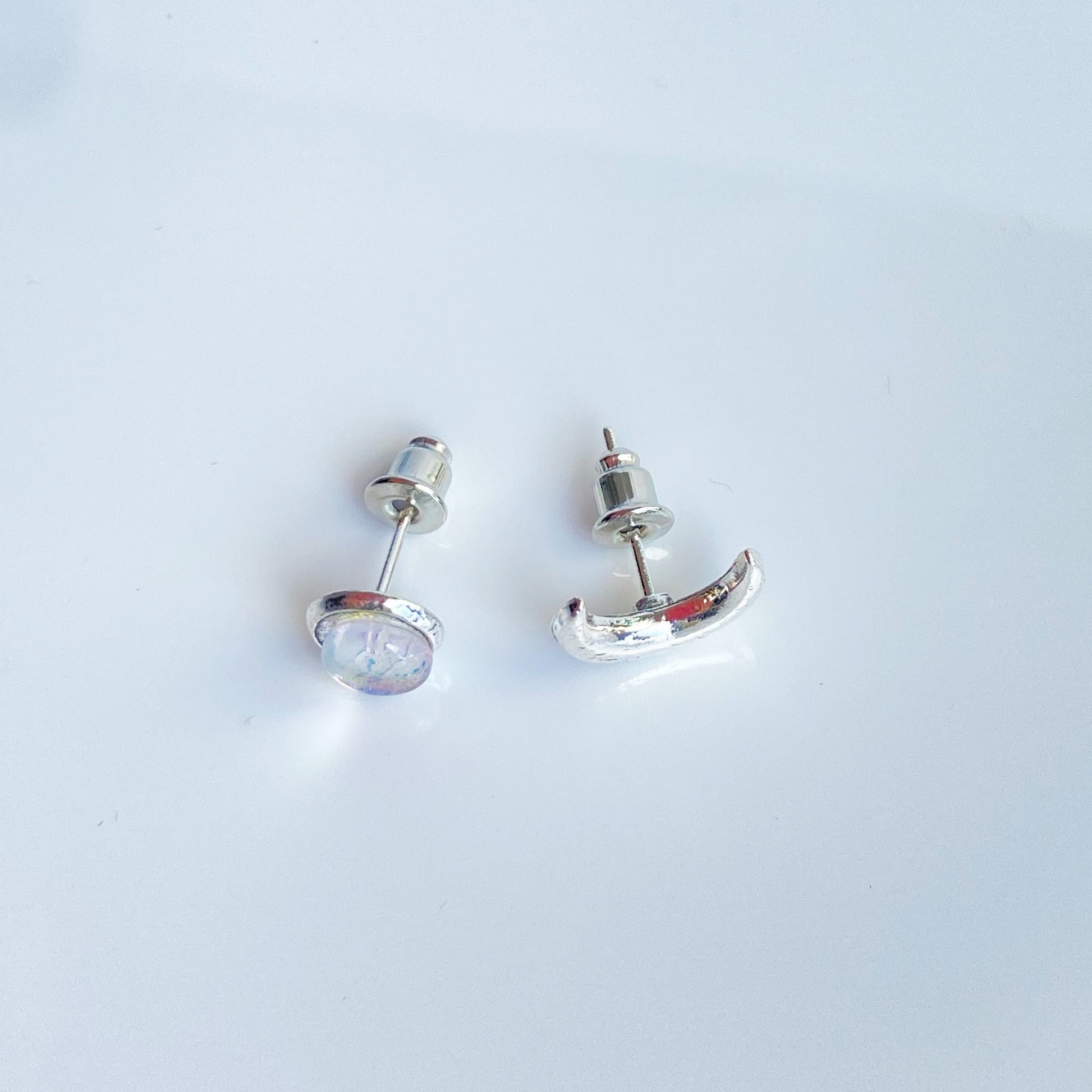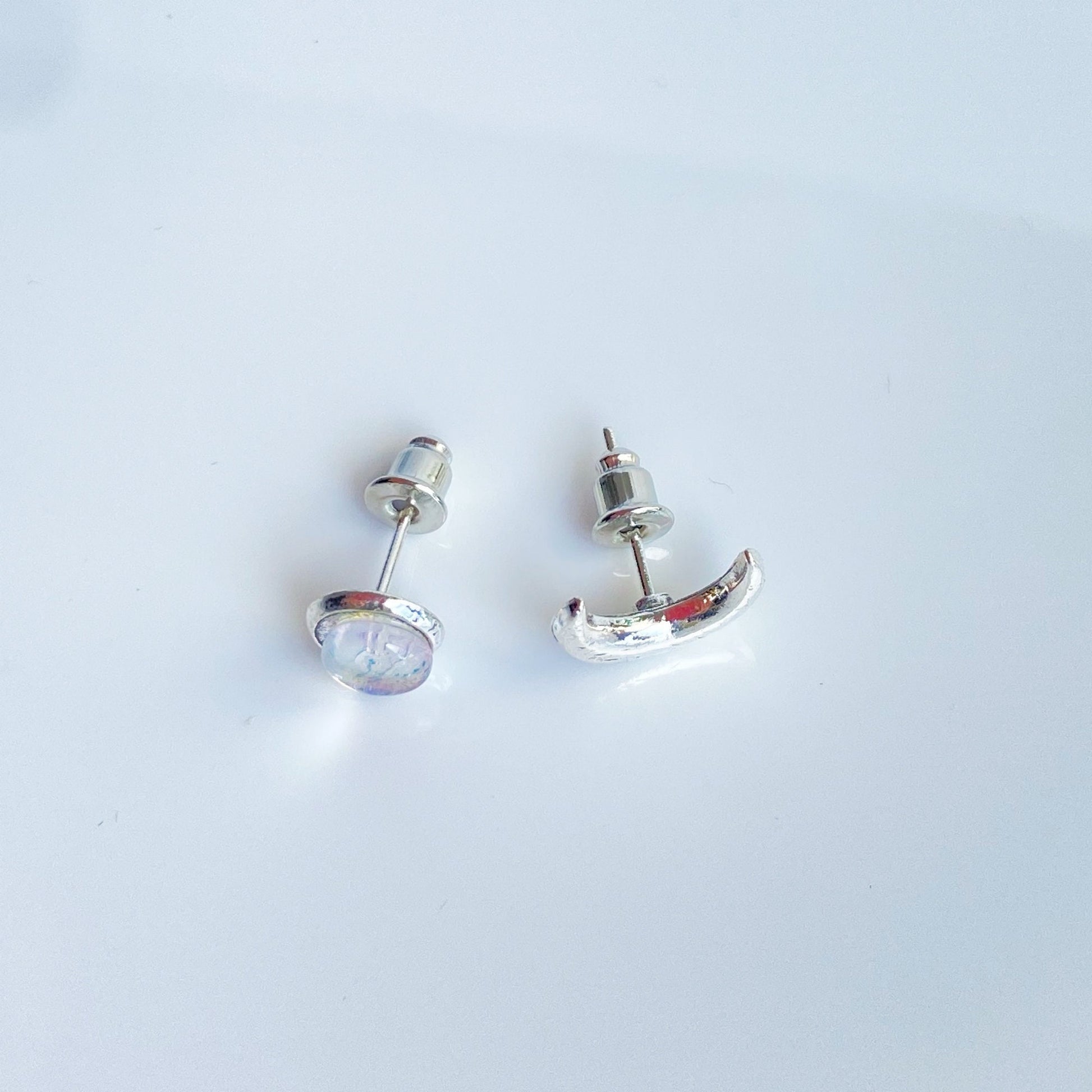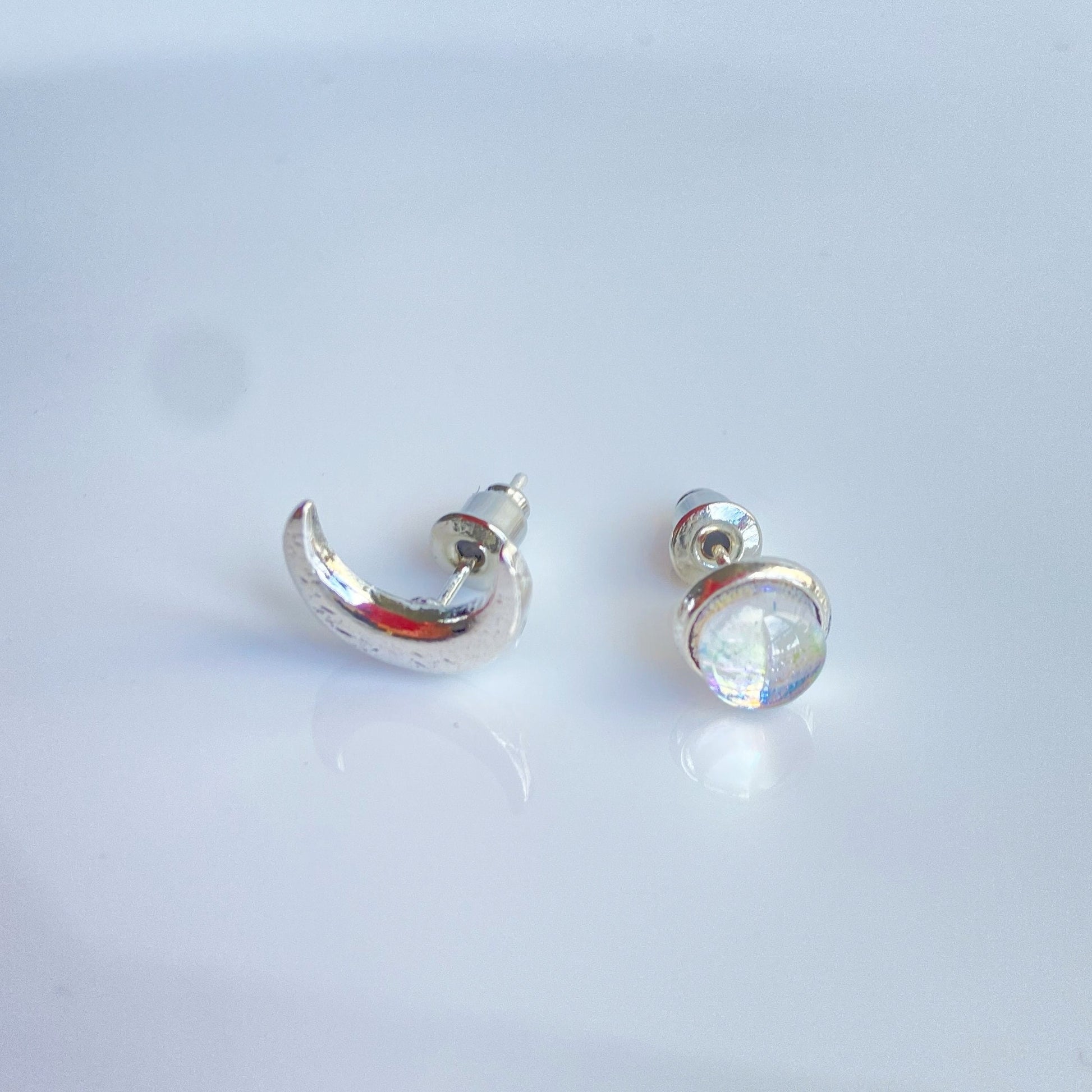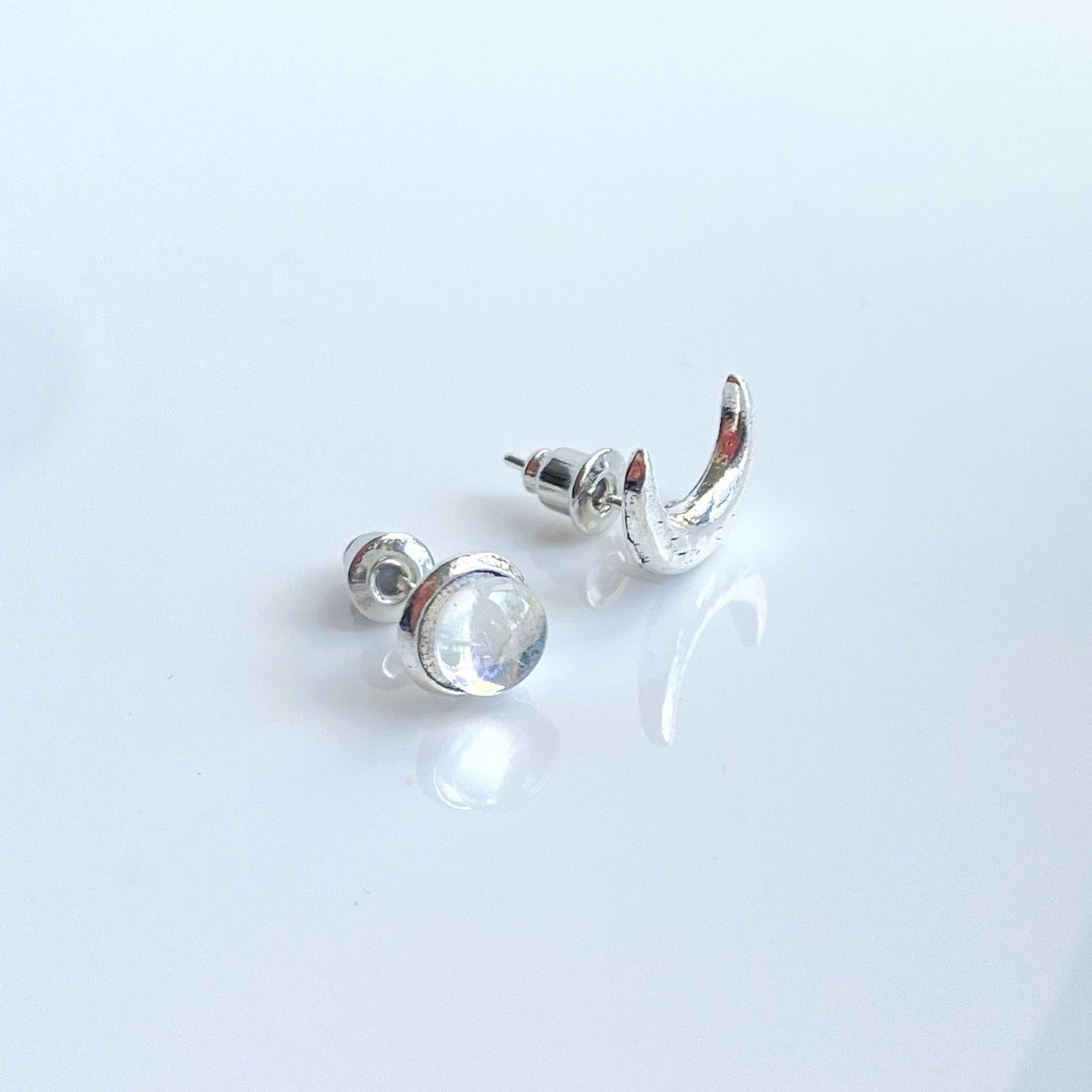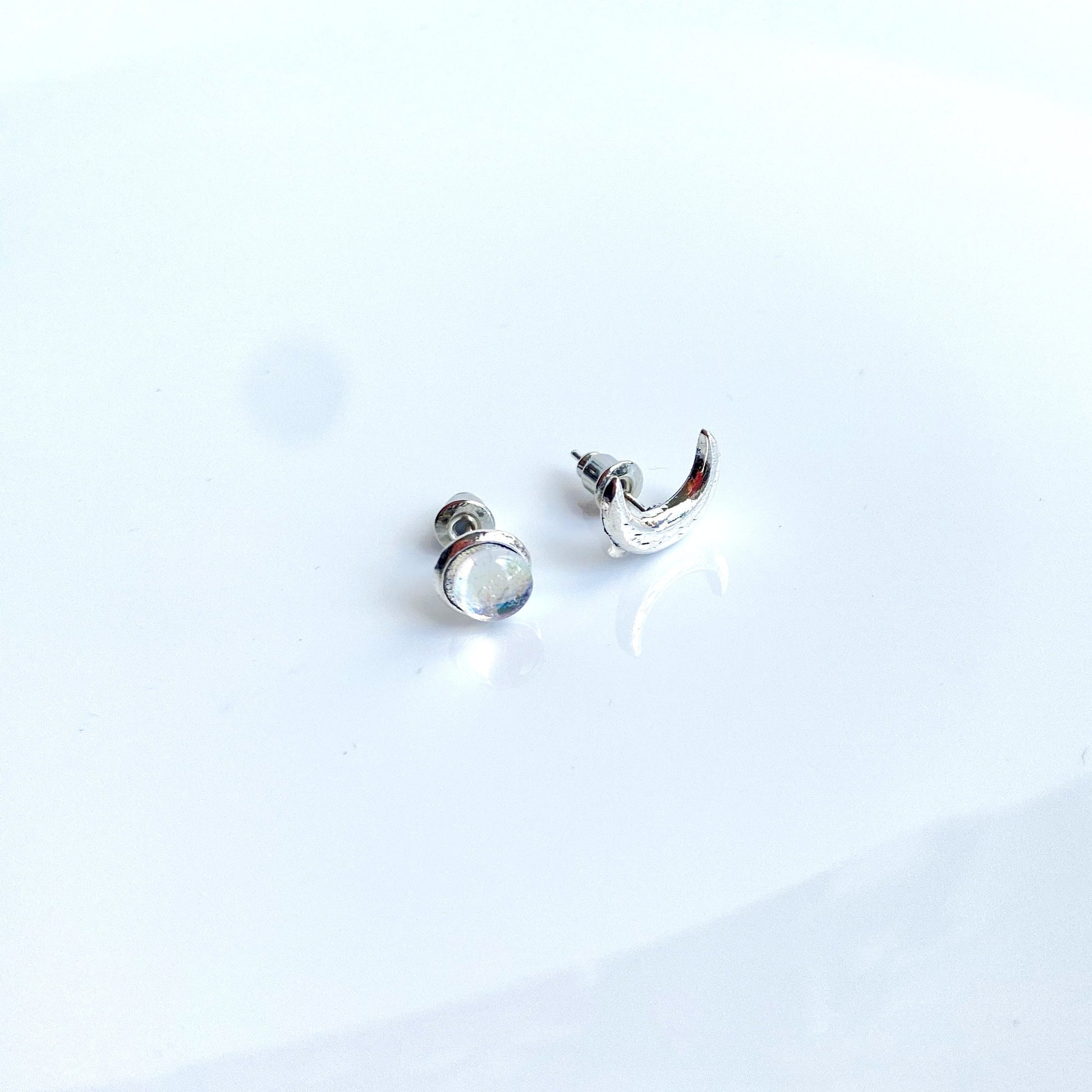 Tiny Moon and moonstone mismatched stud earrings , Celestial jewelry for women , Minimalist Crescent Moon Earrings