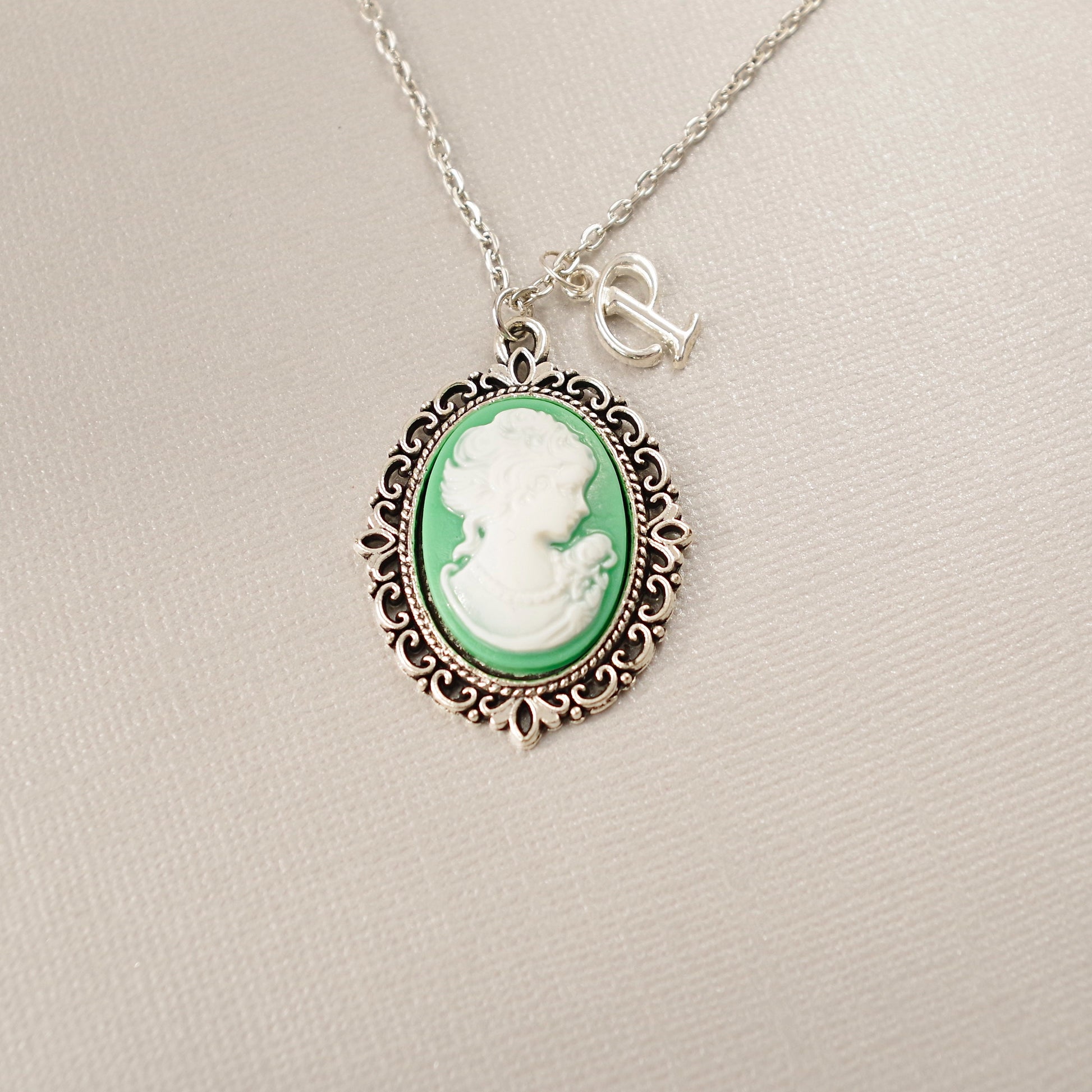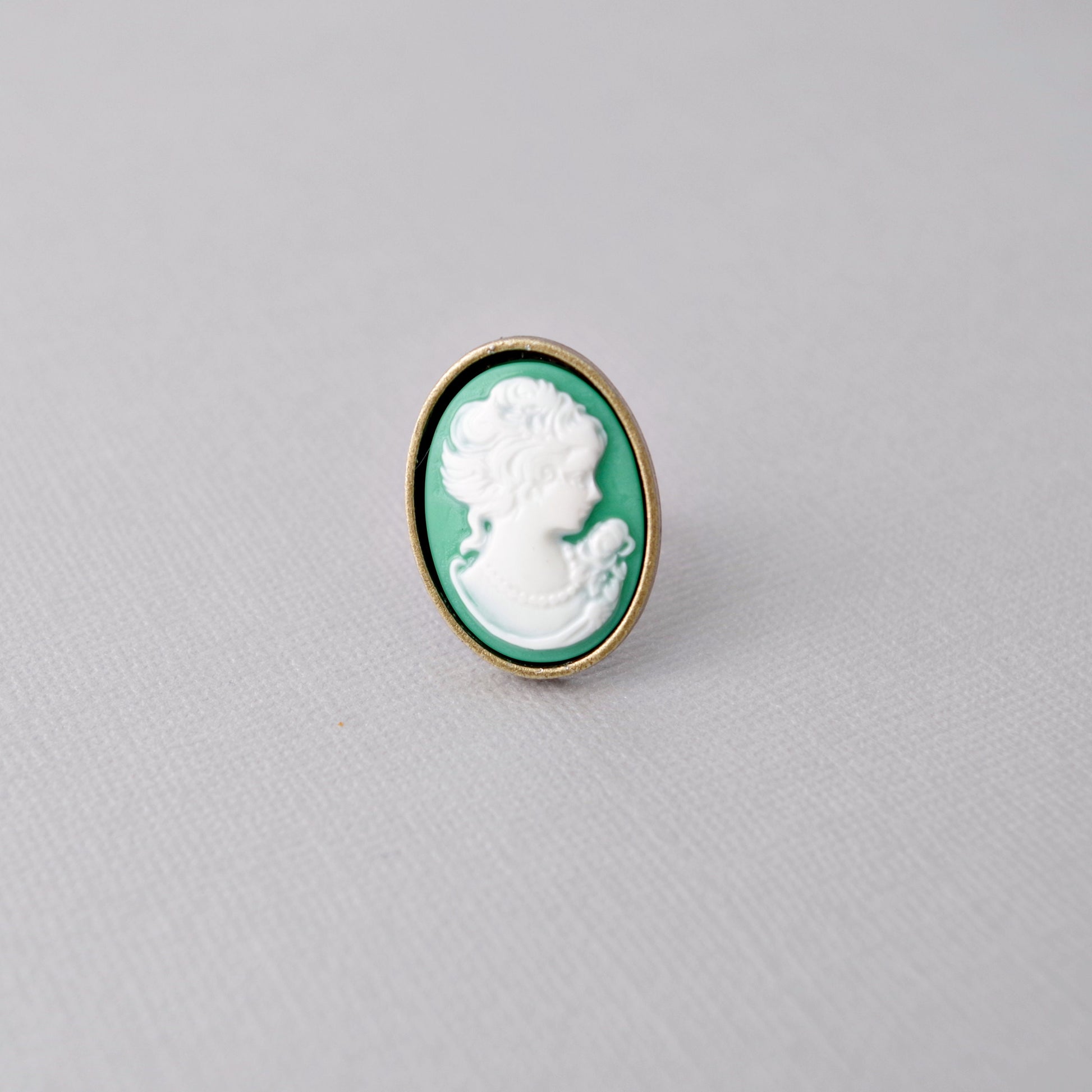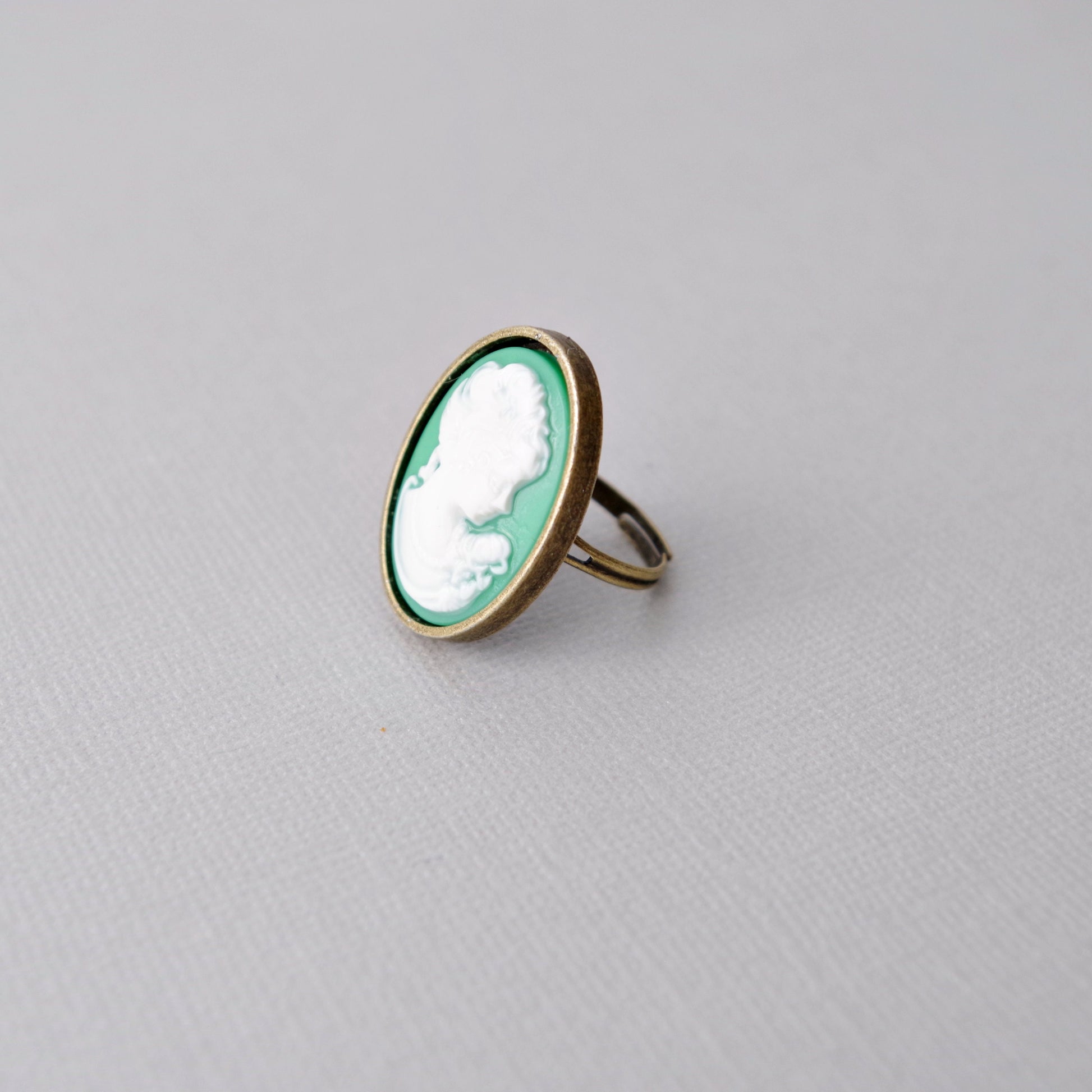 Bague camée dame victorienne – Bijou vintage vert et blanc, monture bronze réglable